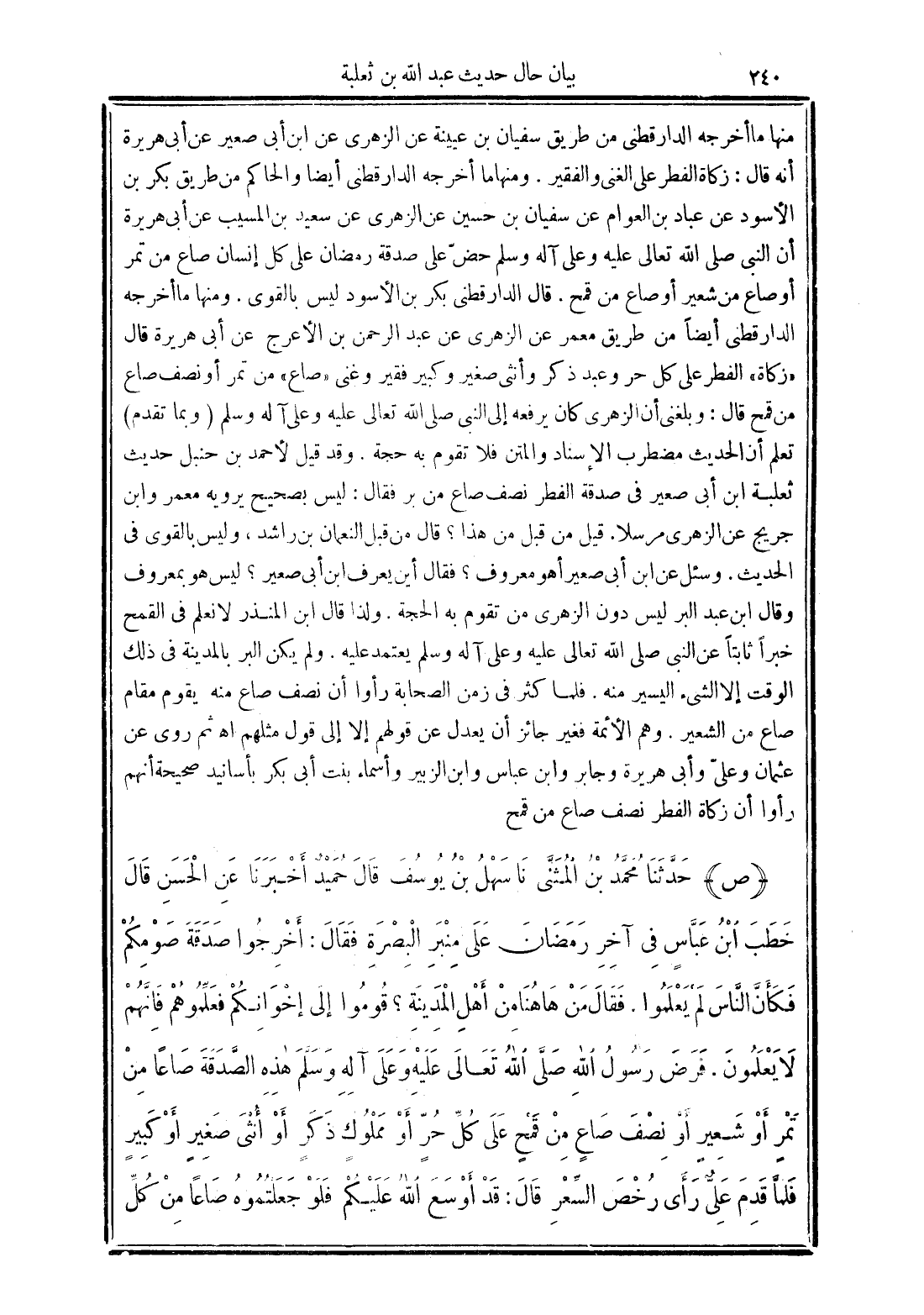ومنها ما أخرجه الدارقطني أيضًا من طريق معمر عن الزهري عن عبد الرحمن بن الأعرج. عن أبي هريرة قال "زكاة" الفطر على كل حر وعبد ذكر وأنثى صغير وكبير فقير وغنى "صاع" من تمر أو نصف صاع من قمح قال: وبلغني أن الزهري كان يرفعه إلى النبي صلى الله تعالى عليه وعلى آله وسلم