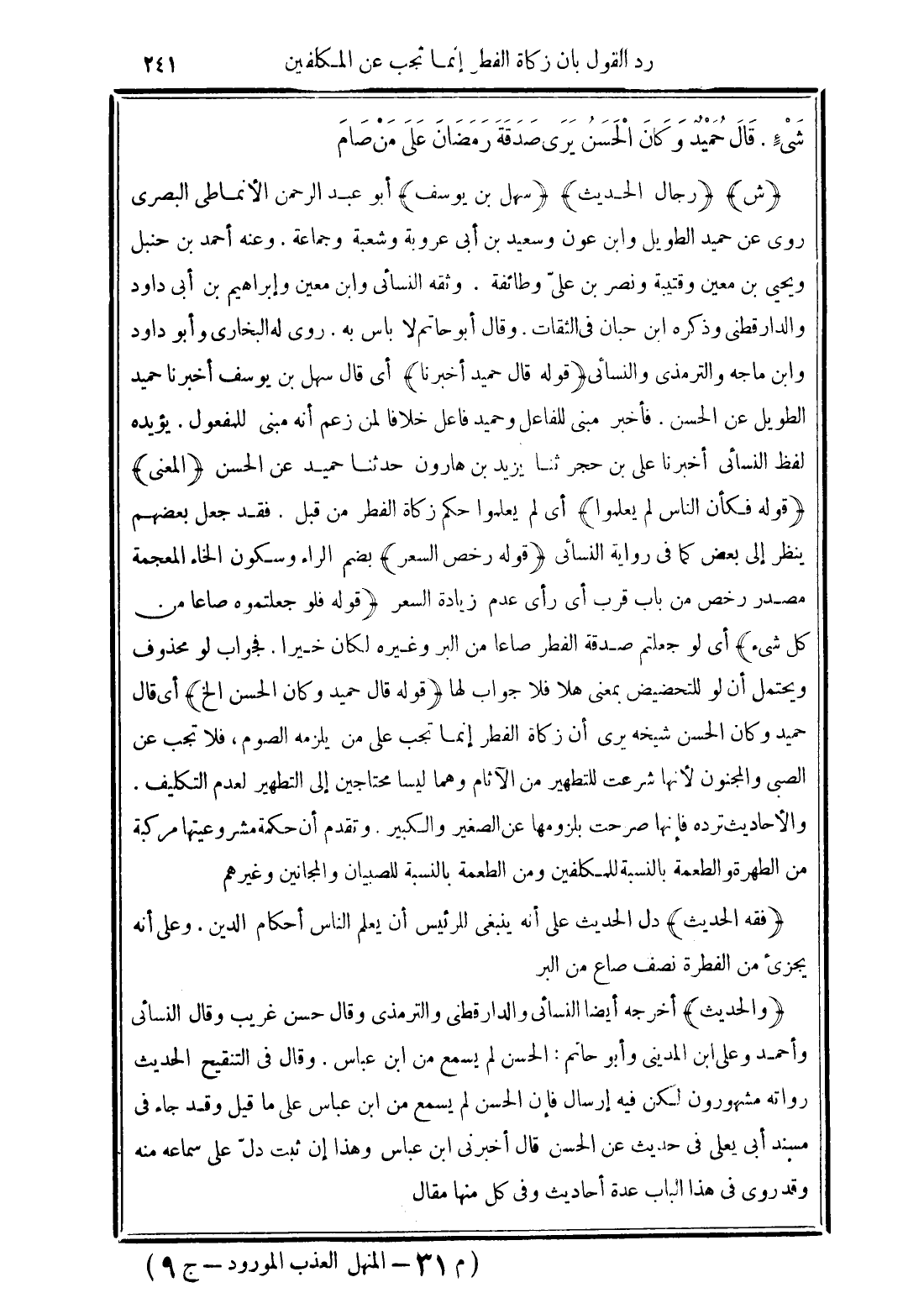 (قوله قال حميد وكان الحسن الخ) أي قال حميد وكان الحسن شيخه يرى أن زكاة الفطر إنما تجب على من يلزمه الصوم، فلا تجب عن الصبي والمجنون لأنها شرعت للتطهير من الآثام وهما ليسا محتاجين إلى التطهير لعدم التكليف.
