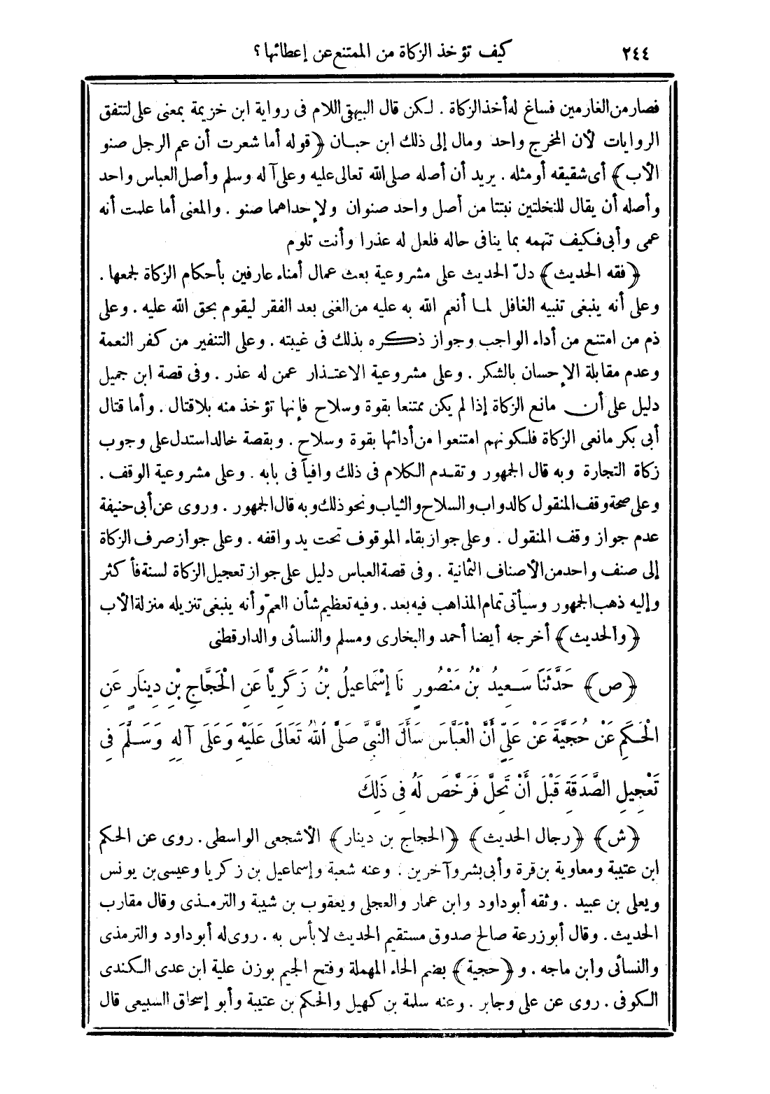 (ص) حَدَّثَنَا سَعِيدُ بْنُ مَنْصُورٍ نَا إِسْمَاعِيلُ بْنُ زَكَرِيَّا عَنِ الْحَجَّاجِ بْنِ دِينَارٍ عَنِ الْحَكَمِ عَنْ حُجَيَّةَ عَنْ عَلِيٍّ أَنَّ الْعَبَّاسَ سَأَلَ النَّبِيَّ -صَلَّى الله تَعَالَى عَلَيْهِ وَعَلَى آلِهِ وَسَلَّمَ- فِي تَعْجِيلِ صَدَقَتِهِ قَبْلَ أَنْ تَحِلَّ فَرَخَّصَ لَهُ فِي ذَلِكَ.