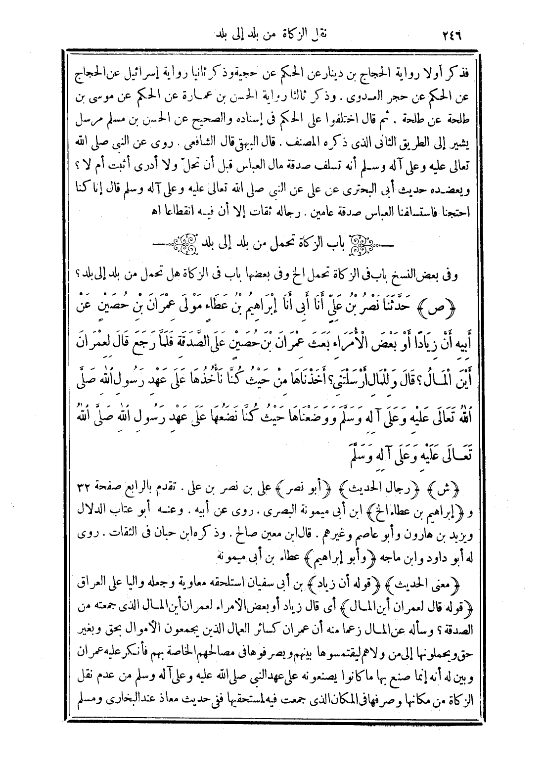 (ص) حَدَّثَنَا نَصْرُ بْنُ عَلِيٍّ أَنَا أَبِي أَنَا إِبْرَاهِيمُ بْنُ عَطَاءٍ مَوْلَى عِمْرَانَ بْنِ حُصَيْنٍ عَنْ أَبِيهِ أَنَّ زِيَادًا أَوْ بَعْضَ الأُمَرَاءِ بَعَثَ عِمْرَانَ بْنَ حُصَيْنٍ عَلَى الصَّدَقَةِ فَلَمَّا رَجَعَ قَالَ لِعِمْرَانَ أَيْنَ الْمَالُ قَالَ وَلِلْمَالِ أَرْسَلْتَنِي أَخَذْنَاهَا مِنْ حَيْثُ كُنَّا نَأْخُذُهَا عَلَى عَهْدِ رَسُولِ اللَّهِ -صَلَّى الله تَعَالَى عَلَيْهِ وَعَلَى آلِهِ وَسَلَّمَ- وَوَضَعْنَاهَا حَيْثُ كُنَّا نَضَعُهَا عَلَى عَهْدِ رَسُولِ اللَّهِ -صَلَّى الله تَعَالَى عَلَيْهِ وَعَلَى آلِهِ وَسَلَّمَ-.