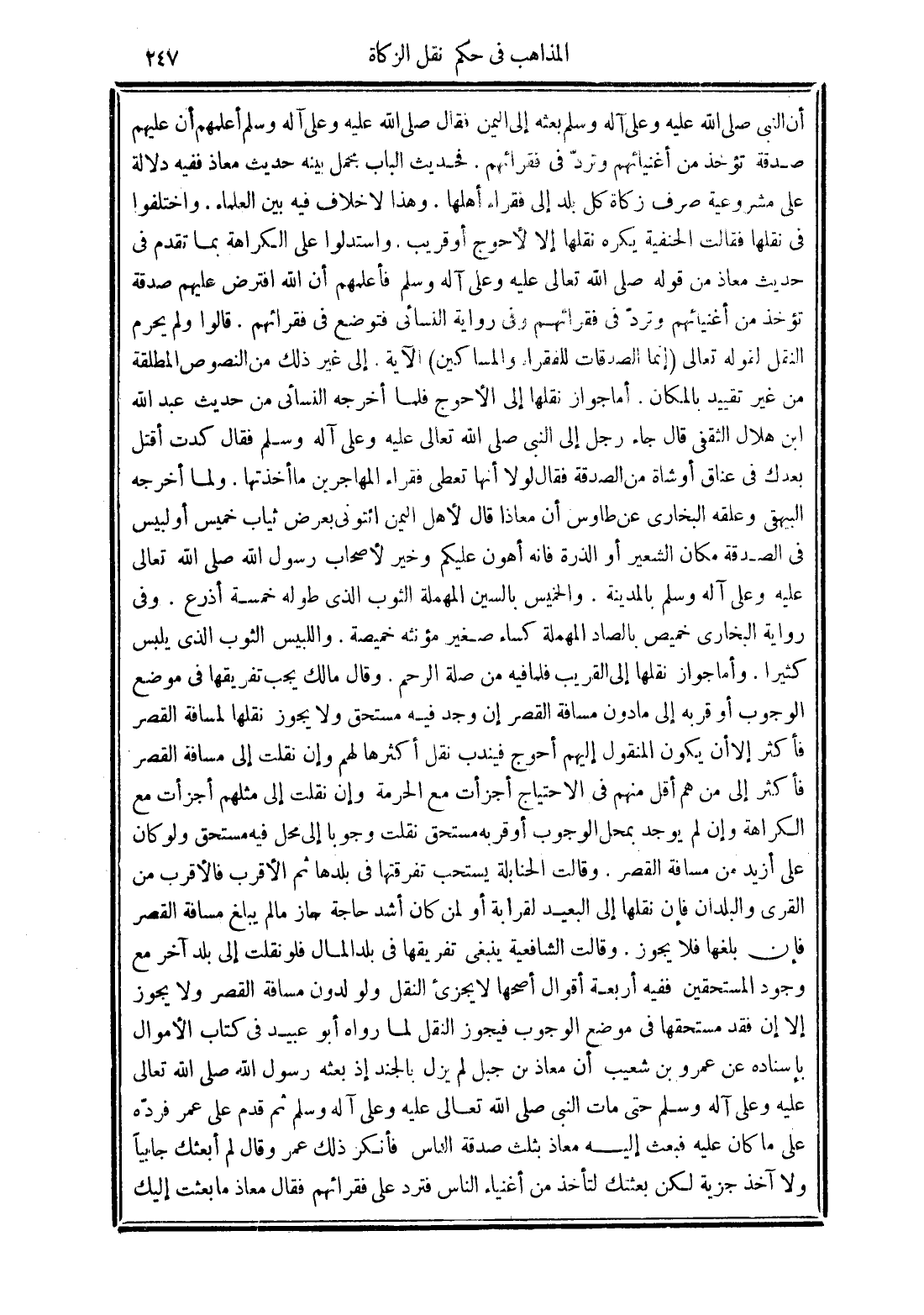 وقالت الحنابلة يستحب تفرقتها في بلدها ثم الأقرب فالأقرب من القرى والبلدان فإن نقلها إلى البعيد لقرابة أولمن كان أشد حاجة جاز ما لم يبلغ مسافة القصر فإن بلغها فلا يجوز. وقالت الشافعية ينبغي تفريقها في بلد المال فلو نقلت إلى بلد آخر مع وجود المستحقين ففيه أربعة أقوال أصحها لا يجزئ النقل ولو لدون مسافة القصر ولا يجوز إلا إن فقد مستحقها في موضع الوجوب فيجوز النقل لما رواه أبو عبيد في كتاب الأموال بإسناده عن عمرو بن شعيب أن معاذ بن جبل لم يزل بالجند إذ بعثه رسول الله صلى الله تعالى عليه وعلى آله وسلم حتى مات النبي صلى الله تعالى عليه وعلى آله وسلم ثم قدم على عمر فردّة على ما كان عليه فبعث إليه معاذ بثلث صدقة الناس فأنكر ذلك عمر وقال لم أبعثك جابيًا ولا آخذ جزية لكن بعثتك لتأخذ من أغنياء الناس فترد على فقرائهم فقال معاذ ما بعثت إليك