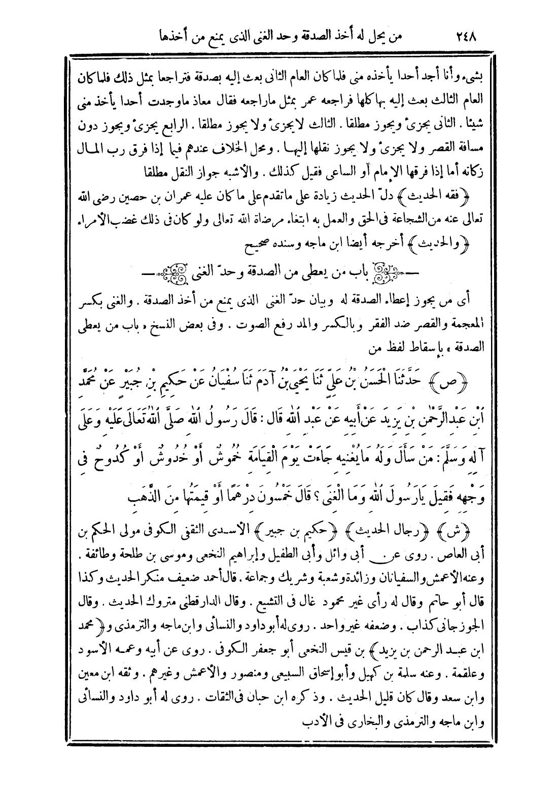 (ص) حَدَّثَنَا الْحَسَنُ بْنُ عَلِيٍّ نَا يَحْيَى بْنُ آدَمَ نَا سُفْيَانُ عَنْ حَكِيمِ بْنِ جُبَيْرٍ عَنْ مُحَمَّدِ بْنِ عَبْدِ الرَّحْمَنِ بْنِ يَزِيدَ عَنْ أَبِيهِ عَنْ عَبْدِ اللَّهِ قَالَ قَالَ رَسُولُ اللَّهِ -صَلَّى الله تَعَالَى عَلَيْهِ وَعَلَى آلِهِ وَسَلَّمَ- "مَنْ سَأَلَ وَلَهُ مَا يُغْنِيهِ جَاءَتْ يَوْمَ الْقِيَامَةِ خُمُوشٌ -أَوْ خُدُوشٌ- أَوْ كُدُوحٌ- فِي وَجْهِهِ". فَقِيلَ يَا رَسُولَ اللَّهِ وَمَا الْغِنَى قَالَ "خَمْسُونَ دِرْهَمًا أَوْ قِيمَتُهَا مِنَ الذَّهَبِ".