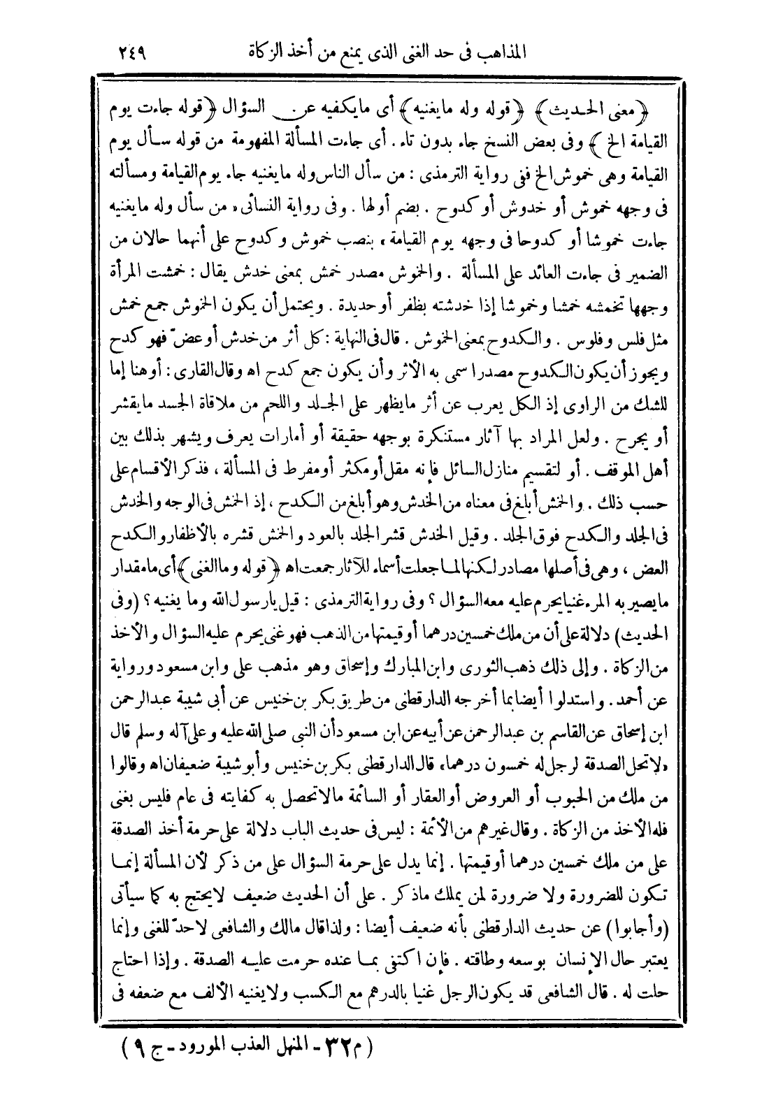 وقال القاري: أو هنا إما للشك من الراوي إذ الكل يعرب عن أثر ما يظهر على الجلد واللحم من ملاقاة الجسد ما يقشر أو يجرح. ولعل المراد بها آثار مستنكرة بوجهه حقيقة أو أمارات يعرف ويشهر بذلك بين أهل الموقف. أولتقسيم منازل السائل فإنه مقل أو مكثر أو مفرط في المسألة، فذكر الأقسام على حسب ذلك. والخمش أبلغ في معناه من الخدش وهو أبلغ من الكدح، إذ الخمش في الوجه والخدش في الجلد والكدح فوق الجلد. وقيل الخدش قشر الجلد بالعود والخمش قشره بالأظفار والكدح العض، وهي في أصلها مصادر لكنها لما جعلت أسماء للآثار جمعت اهـ