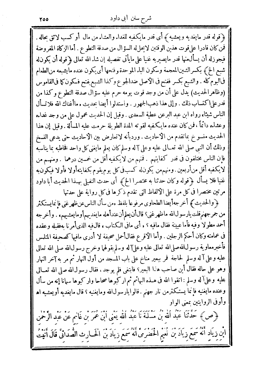 (والحديث) أخرجه أيضًا الطحاوي مرفوعًا بلفظ "من سأل الناس عن ظهر غنى فإنما يستكثر من جمر جهنم قلت يا رسول الله ما ظهر غنى؟ قال أن يعلم أن عند أهله ما يغديهم أو ما يعشيهم". وأخرجه أحمد مطولًا وفيه فأما عيينة فقال ما فيه؟ "أي ما في الكتاب" قال فيه الذي أمرنا به فقبله وعقده في عمامته وكان أحكم الرجلين. وأما الأقرع فقال أحمل صحيفة لا أدري ما فيها كصحيفة المتلبس فأخبر معاوية رسول الله صلى الله تعالى عليه وعلى آله وسلم بقولهما وخرج رسول الله صلى الله تعالى عليه وعلي آله وسلم لحاجة فمر ببعير مناخ على باب المسجد من أول النهار ثم مر به أخر النهار وهو على حاله فقال أين صاحب هذا البعير؟ فابتغى فلم يوجد، فقال رسول الله صلى الله تعالى عليه وعلي آله وسلم: اتقوا الله في هذه البهائم ثم اركبوها صحاحًا واركبوها سمانًا إنه من سأل وعنده ما يغنيه فإنما يستكثر من نار جهنم. قالوا يا رسول الله وما يغنيه؟ قال ما يغديه أو يعشيه اهـ