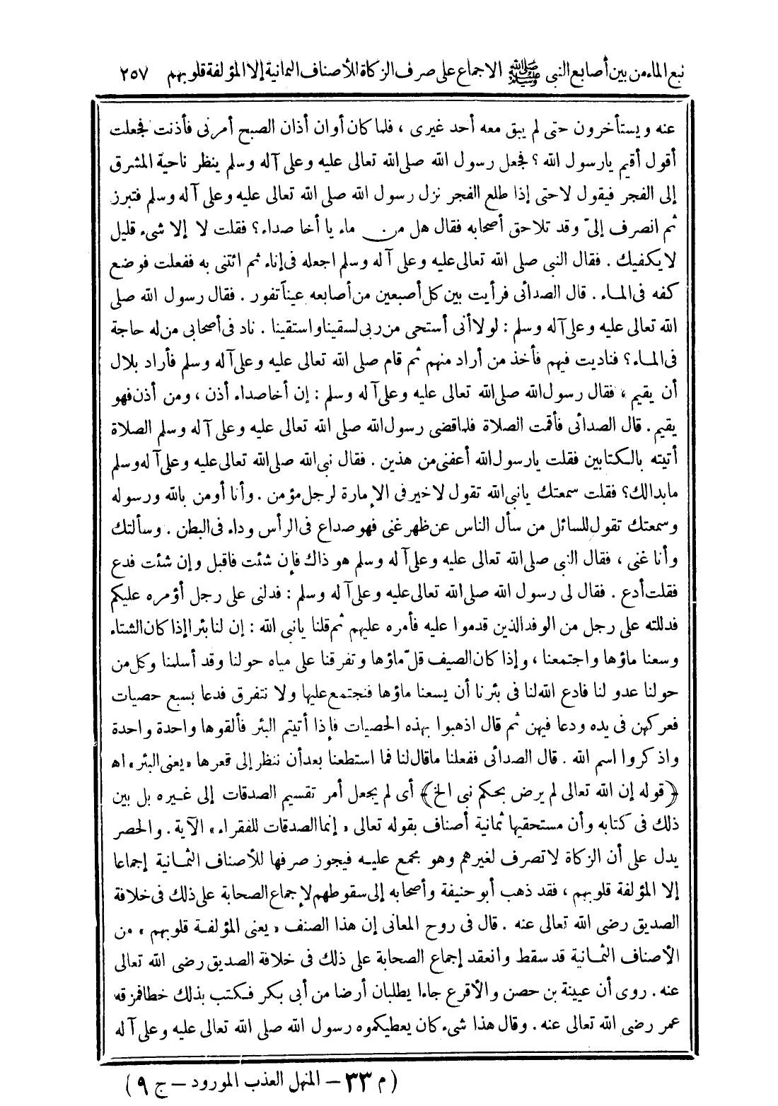 (قوله إن الله تعالى لم يرض بحكم نبي الخ) أي لم يجعل أمر تقسيم الصدقات إلى غيره بل بين ذلك في كتابه وأن مستحقيها ثمانية أصناف بقوله تعالى (إِنَّمَا الصَّدَقَاتُ لِلْفُقَرَاءِ) الآية. والحصر يدل علي أن الزكاة لا تصرف لغيرهم وهو مجمع عليه فيجوز صرفها للأصناف الثمانية إجماعًا إلا المؤلفة قلوبهم، فقد ذهب أبو حنيفة وأصحابه إلى سقوطهم لإجماع الصحابة على ذلك في خلافة الصديق رضي الله تعالى عنه. قال في روح المعاني إن هذا الصنف "يعني المؤلفة قلوبهم" من الأصناف الثمانية قد سقط وانعقد إجماع الصحابة على ذلك في خلافة الصديق رضي الله تعالى عنه. روى أن عيينة بن حصن والأقرع جاءا يطلبان أرضًا من أبي بكر فكتب بذلك خطأ فمزقه عمر رضي الله تعالى عنه. وقال هذا شيء كان يعطيكموه رسول الله صلى الله تعالى عليه وعلي آله