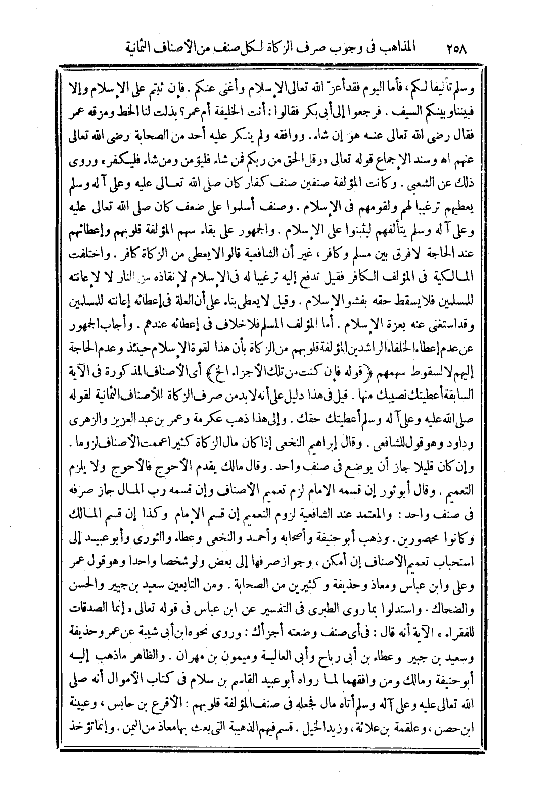 واستدلوا بما روى الطبري في التفسير عن ابن عباس في قوله تعالى (إِنَّمَا الصَّدَقَاتُ لِلْفُقَرَاءِ) الآية أنه قال: في أي صنف وضعته أجزأك: وروى نحوه ابن أبي شيبة عن عمر وحذيفة وسعيد في جبير وعطاء بن أبي رباح وأبي العالية وميمون بن مهران.