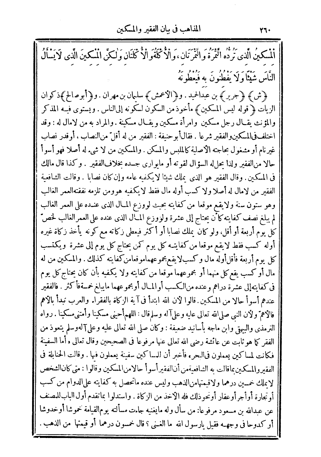 وقالت الحنابلة في الفقير والمسكين بما قالت به الشافعية من أن الفقير أسوأ حالًا من المسكين وقالوا: متى كان الشخص لا يملك خمسين درهما ولا قيمتها من الذهب وليس عنده ما تحصل به كفايته على الدوام من كسب أو تجارة أو أجر أو عقار أو نحو ذلك فله الأخذ من الزكاة. واستدلوا بما تقدم أول الباب للمصنف عن عبد الله بن مسعود مرفوعًا: من سأل وله ما يغنيه جاءت مسألته يوم القيامة خموشًا أو خدوشًا أو كدوحًا في وجهه فقيل يا رسول الله ما الغنى؟ قال خمسون درهما أو قيمتها من الذهب.