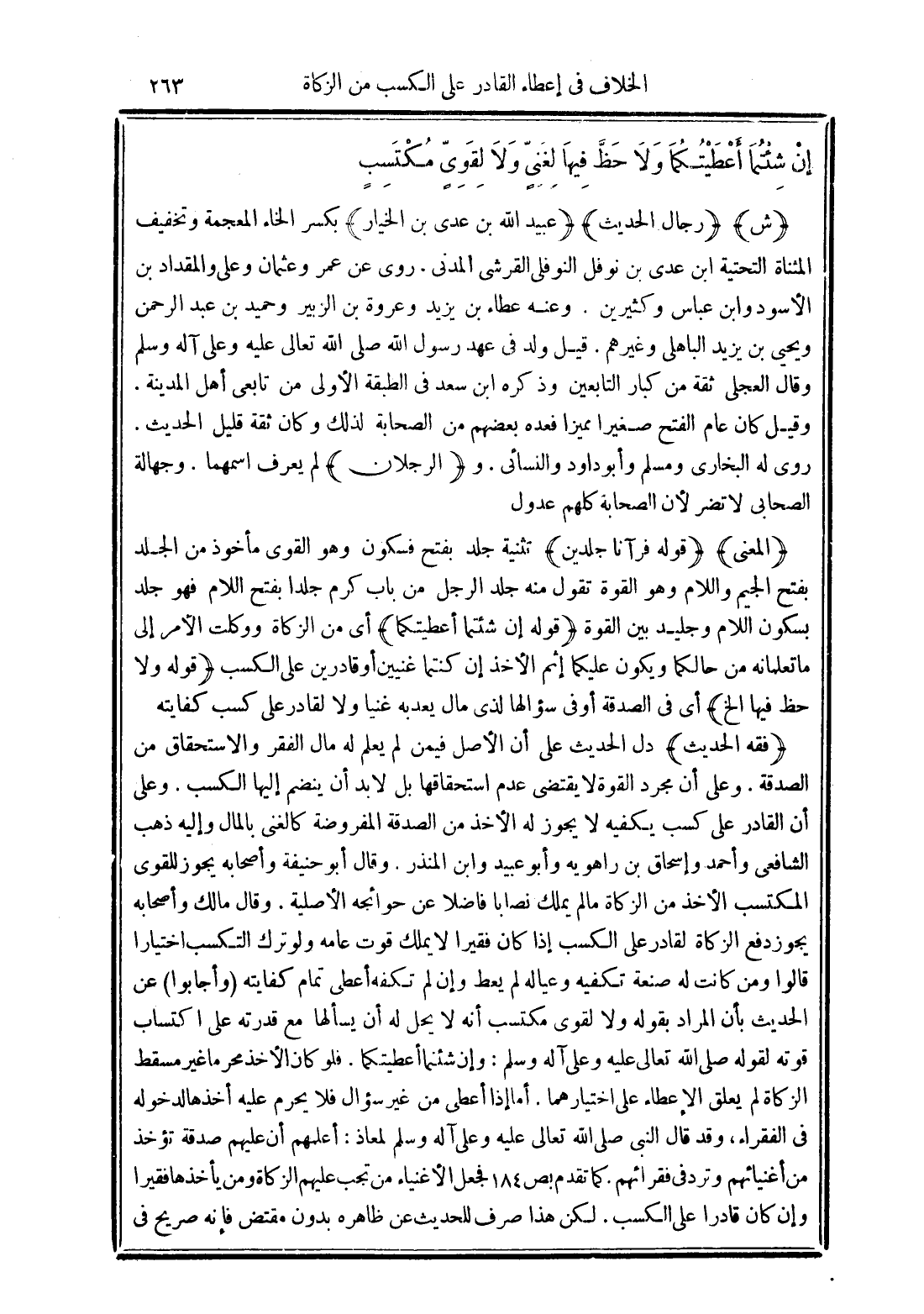 (وأجابوا) عن الحديث بأن المراد بقوله ولا لقوي مكتسب أنه لا يحل له أن يسألها مع قدرته علي اكتساب قوته لقوله صلى الله تعالى عليه وعلى آله وسلم: وإن شئتما أعطيتكما. فلوكان الأخذ محرمًا غير مسقط الزكاة لم يعلق الإعطاء على اختيارهما. أما إذا أعطى من غير سؤال فلا يحرم عليه أخذها لدخوله في الفقراء، وقد قال النبي صلى الله تعالى علي وعلى آله وسلم لمعاذ: أعلمهم أن عليهم صدقة تؤخذ من أغنيائهم وترد في فقرائهم. كما تقدم بـ ص 184 فجعل الأغنياء من تجب عليهم الزكاة ومن يأخذها فقيرًا وإن كان قادرًا على الكسب. لكن هذا صرف للحديث عن ظاهره بدون مقتض فإنه صريح في