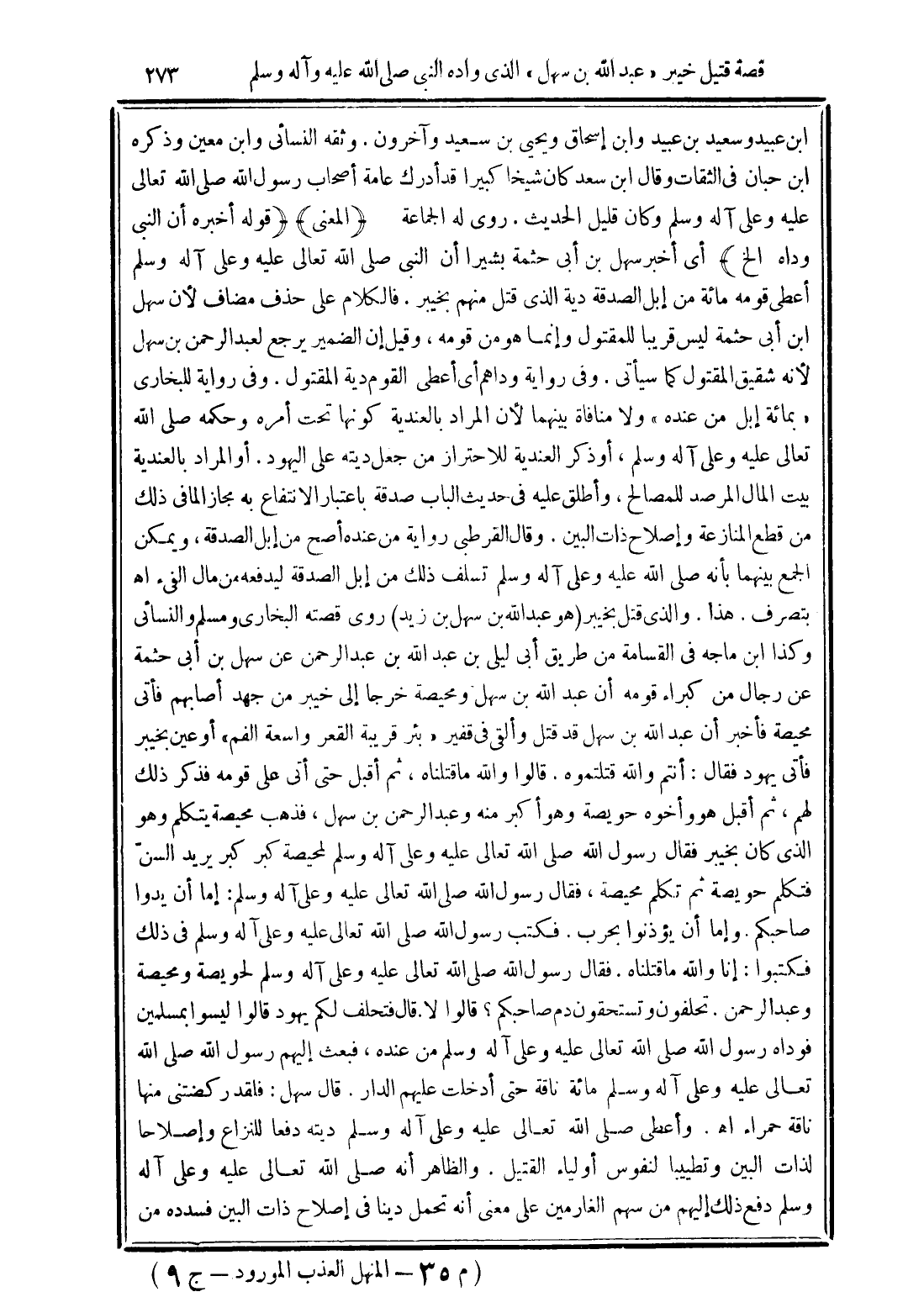 فتكلم حويصة ثم تكلم محيصة، فقال رسول الله صلى الله تعالى عليه وعلى آله وسلم: إما أن يدوا صاحكبم. وإما أن يؤذنوا بحرب. فكتب رسول الله صلى الله تعالى عليه وعلى آله وسلم في ذلك فكتبوا: إنا والله ما قتلناه. فقال رسول الله صلى الله تعالى عليه وعلى آله وسلم لحويصة ومحيصة وعبد الرحمن. تحلفون وتستحقون دم صاحبكم؟ قالوا لا. قال فتحلف لكم يهود قالوا ليسوا بمسلمين فوداه رسول الله صلى الله تعالى عليه وعلى آله وسلم من عنده، فبعث إليهم رسول الله صلى الله تعالى عليه وعلى آله وسلم مائة ناقة حتى أدخلت عليهم الدار. قال سهل: فلقد ركضتني منها ناقة حمراء اهـ.
