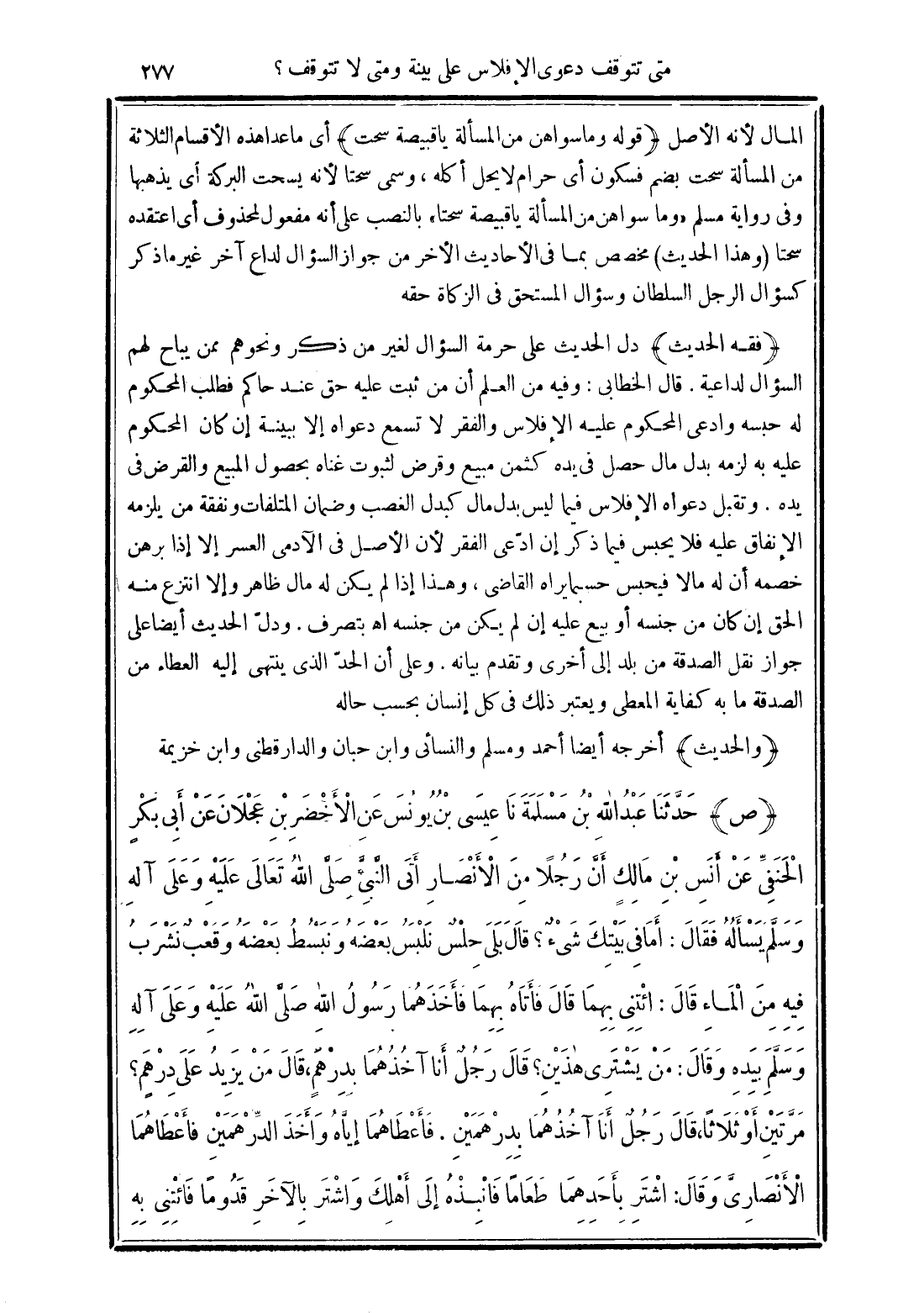 (فقه الحديث) دل الحديث على حرمة السؤال لغير من ذكر ونحوهم ممن يباح لهم سؤال لداعية. قال الخطابي: وفيه من العلم أن من ثبت عليه حق عند حاكم فطلب المحكوم له حبسه وادعى المحكوم عليه الإفلاس والفقر لا تسمع دعواه إلا ببية إن كان المحكوم عليه به لزمه بدل مال حصل في يده كثمن مبيع وقرض لثبوت غناه بحصول المبيع والقرض في يده. وتقبل دعواه الإفلاس فيما ليس بدل مال كبدل الغصب وضمان المتلفات ونفقة من يلزمه الإنفاق عليه فلا يحبس فيما ذكر إن ادعى الفقر لأن الأصل في الآدمي العسر إلا إذا برهن خصمه أن له مالًا فيحبس حسبما يراه القاضي، وهذا إذا لم يكن له مال ظاهر وإلا انتزع منه الحق إن كان من جنسه أو بيع عليه إن لم يكن من جنسه اهـ بتصرف. ودلّ الحديث أيضًا على جواز نقل الصدقة من بلد إلى أخرى وتقدم بيانه. وعلى أن الحدّ الذي ينتهى إليه العطاه من الصدقة ما به كفاية المعطى ويعتبر ذلك في كل إنسان بحسب حاله