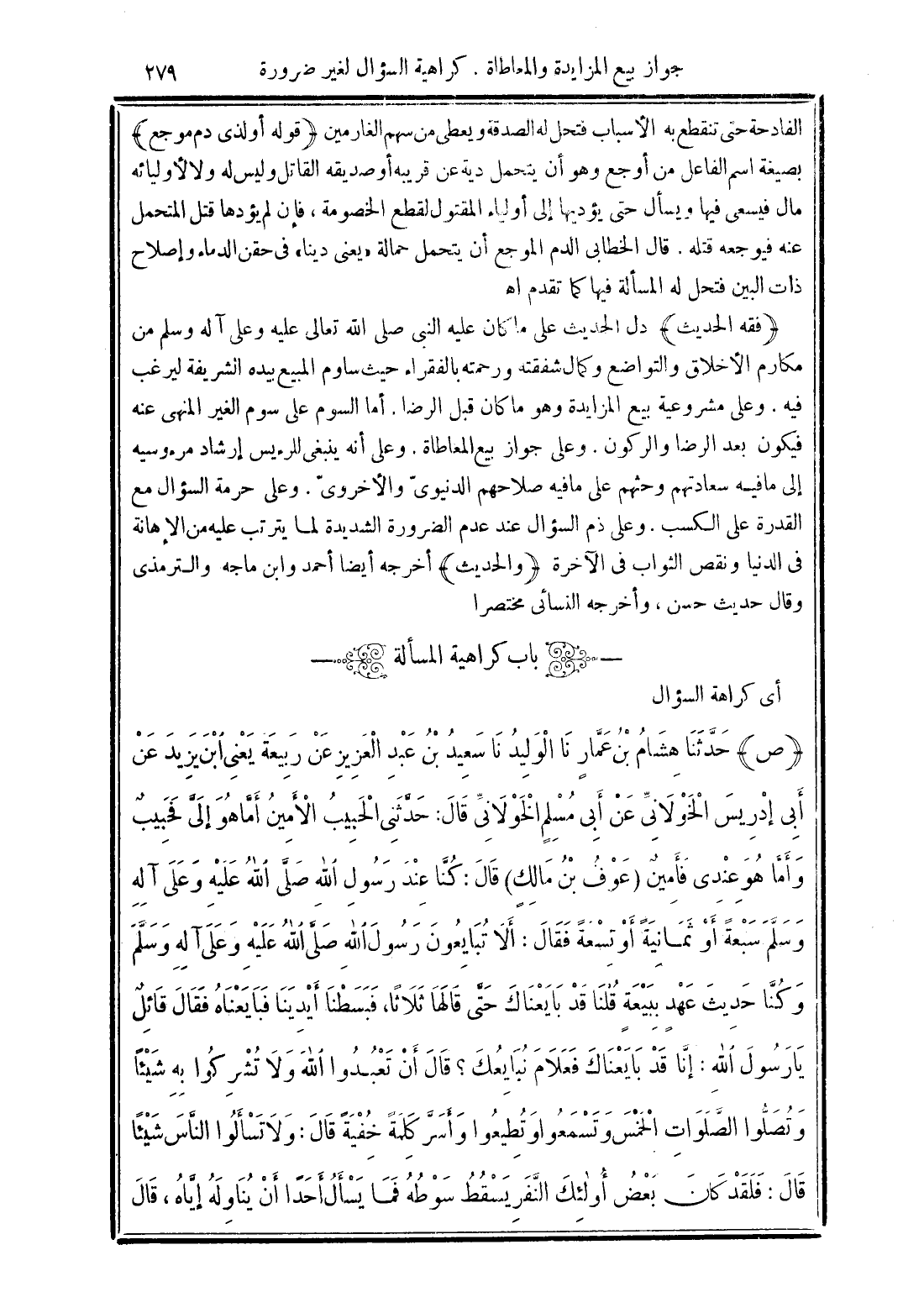 (فقه الحديث) دل الحديث على ما كان عليه النبي صلى الله وتعالى عليه وعلى آله وسلم من مكارم الأخلاق والتواضع وكما شفقته ورحمته بالفقراء حيث ساوم المبيع بيده الشريفة ليرغب فيه. وعلى مشروعية بيع المزايدة وهو ما كان قبل الرضا. أما السوم على سوم الغير المنهي عنه فيكون بعد الرضا والركون. وعلى جواز بيع المعاطاة. وعلى أنه ينبغي للرءيس إرشاد مرءوسيه إلى ما فيه سعادتهم وحثهم على ما فيه صلاحهم الدنيويّ والأخرويّ. وعلى حرمة السؤال مع القدرة على الكسب. وعلى ذم السؤال عند عدم الضرورة الشديدة لما يترتب عليه من الإهانة في الدنيا ونقص الثواب في الآخرة