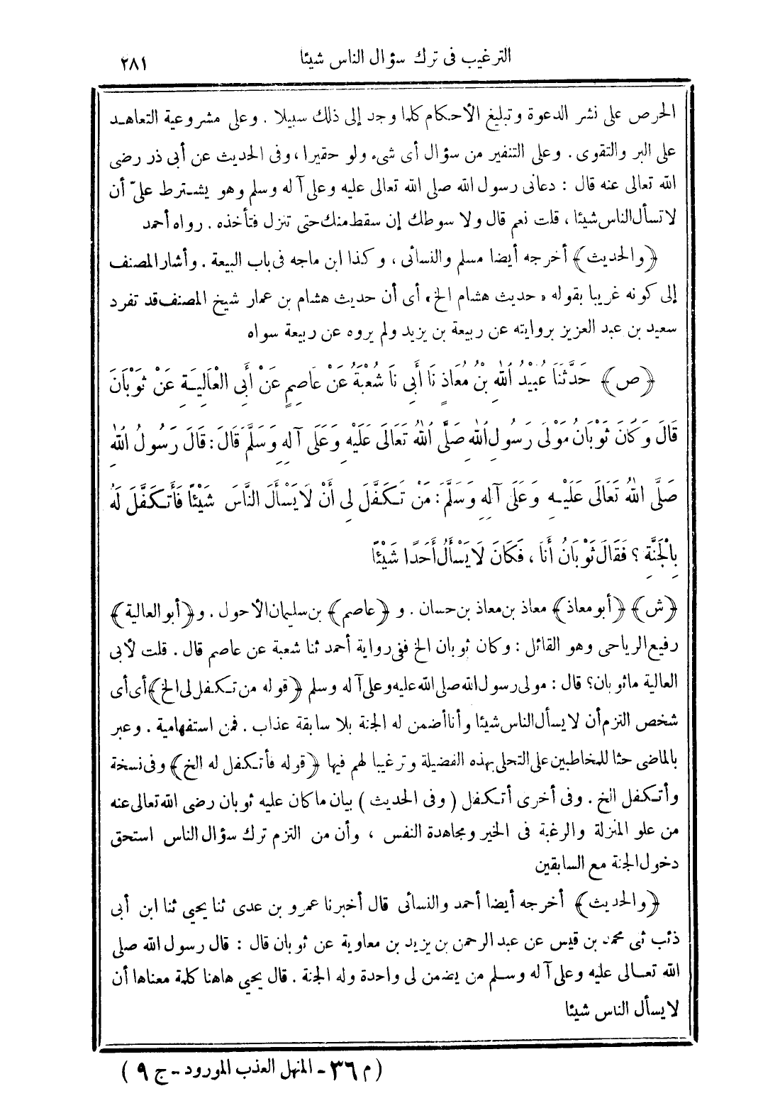 (والحديث) أخرجه أيضًا أحمد والنسائي قال أخبرنا عمروبن عدي ثنا يحيى ثنا ابن أبي ذئب ثنى محمَّد بن قيس عن عبد الرحمن بن يزيد بن معاوية عن ثوبان قال: قال رسول الله صلى الله تعالى عليه وعلى آله وسلم من يضمن لي واحدة وله الجنة. قال يحيى ها هنا كلمة معناها أن لا يسأل الناس شيئًا
