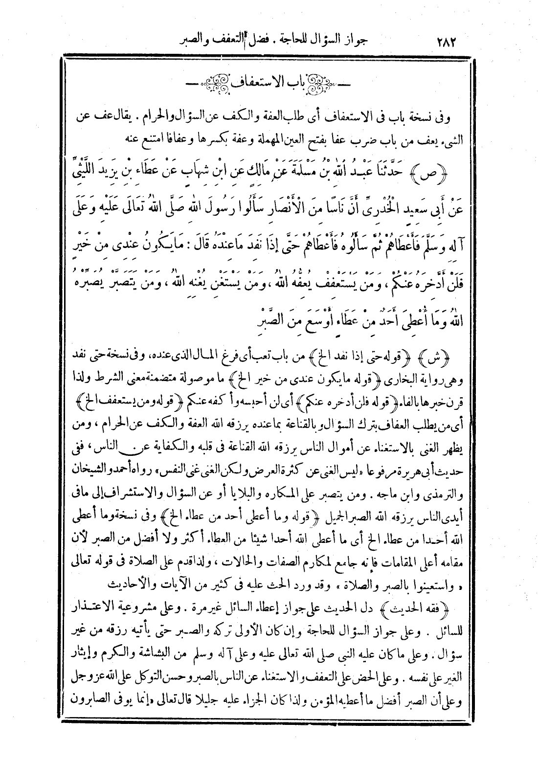 (فقه الحديث) دل الحديث على جواز إعطاء السائل غير مرة. وعلى مشروعية الاعتذار للسائل. وعلى جواز السؤال للحاجة وإن كان الأولى تركه والصبر حتى يأتيه رزقه من غير سؤال. وعلى ما كان عليه النبي صلى الله تعالى عليه وعلى آله وسلم من البشاشة والكرم وإيثار الغير على نفسه. وعلى الحض على التعفف والإستغناء عن الناس بالصبر وحسن التوكل على الله عَزَّ وَجَلَّ وعلي أن الصبر أفضل ما أعطيه المؤمن ولذا كان الجزاء عليه جليلًا قال تعالى (إِنَّمَا يُوَفَّى الصَّابِرُونَ