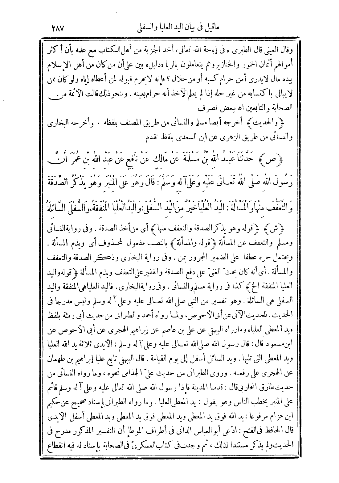 (ص) حَدَّثَنَا عَبْدُ اللَّهِ بْنُ مَسْلَمَةَ عَنْ مَالِكٍ عَنْ نَافِعٍ عَنْ عَبْدِ اللَّهِ بْنِ عُمَرَ أَنَّ رَسُولَ اللَّهِ -صَلَّى الله تَعَالَى عَلَيْهِ وَعَلَى آلِهِ وَسَلَّمَ- قَالَ وَهُوَ عَلَى الْمِنْبَرِ وَهُوَ يَذْكُرُ الصَّدَقَةَ وَالتَّعَفُّفَ مِنْهَا وَالْمَسْأَلَةَ "الْيَدُ الْعُلْيَا خَيْرٌ مِنَ الْيَدِ السُّفْلَى وَالْيَدُ الْعُلْيَا الْمُنْفِقَةُ وَالسُّفْلَى السَّائِلَةُ".