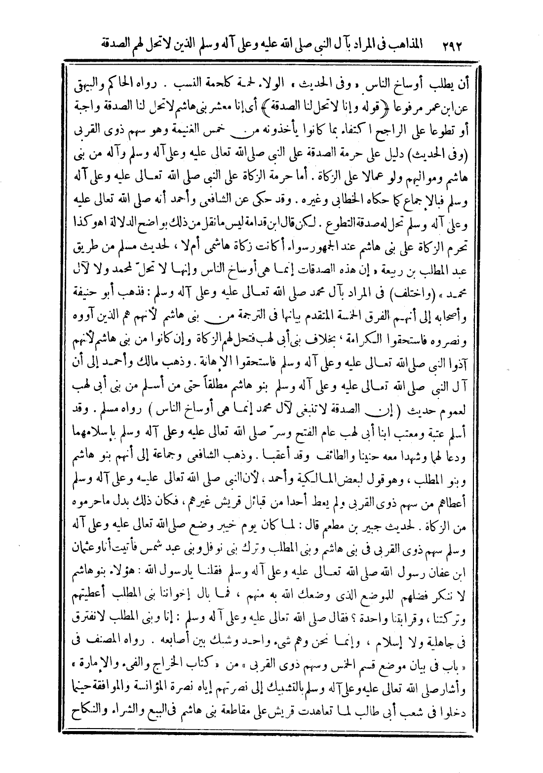 وذهب مالك وأحمد إلى أن آل النبي صلى الله تعالي عليه وعلى آله وسلم بنو هاشم مطلقًا حتى من أسلم من بني أبي لهب لعموم حديث (إن الصدقة لا تنبغي لآل محمد إنما هي أوساخ الناس) رواه مسلم. وقد أسلم عتبة ومعتب ابنا أبي لهب عام الفتح وسرّ صلى الله تعالى عليه وعلى آله وسلم. بإسلامهما ودعا لهما وشهدا معه حنينًا والطائف وقد أعقبا. وذهب الشافعي وجماعة إلى أنهم بنو هاشم وبنو المطلب، وهو قول لبعض المالكية وأحمد لأن النبي صلى الله تعالى عليه وعلى آله وسلم أعطاهم من سهم ذوى القربى لم يعط أحدًا من قبائل قريش غيرهم، فإن ذلك بدل ما حرموه من الزكاة. لحديث جبير بن مطعم قال: لما كان يوم خيبر وضع صلى الله تعالى عليه وعلى آله وسلم سهم ذوى القربي في بني هاشم وبني المطلب.