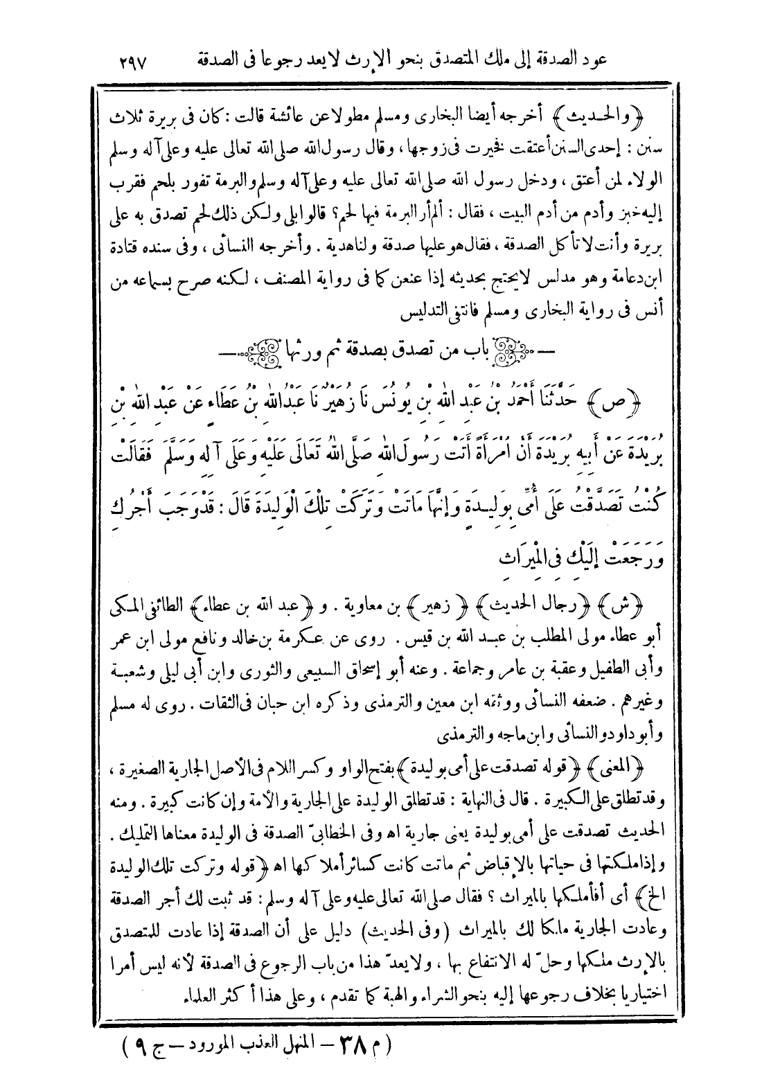 (وفي الحديث) دليل على أن الصدقة إذا عادت للمتصدق بالإرث ملكها وحلّ له الانتفاع بها, ولا يعدّ هذا من باب الرجوع في الصدقة لأنه ليس أمرًا اختياريًا بخلاف رجوعها إليه بنحو الشراء والهبة كما تقدم، وعلى هذا أكثر العلماء