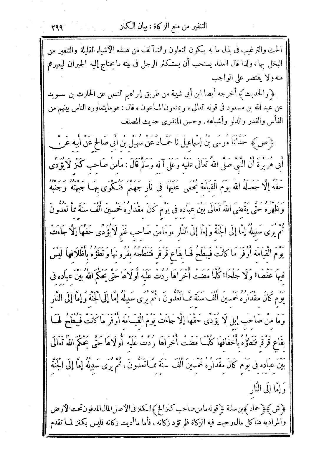 (ص) حَدَّثَنَا مُوسَى بْنُ إِسْمَاعِيلَ نَا حَمَّادٌ عَنْ سُهَيْلِ بْنِ أَبِي صَالِحٍ عَنْ أَبِيهِ عَنْ أَبِي هُرَيْرَةَ أَنَّ رَسُولَ اللَّهِ -صَلَّى الله تَعَالَى عَلَيْهِ وَعَلَى آلِهِ وَسَلَّمَ- قَالَ "مَا مِنْ صَاحِبِ كَنْزٍ لاَ يُؤَدِّي حَقَّهُ إِلاَّ جَعَلَهُ اللَّهُ يَوْمَ الْقِيَامَةِ يُحْمَى عَلَيْهَا فِي نَارِ جَهَنَّمَ فَتُكْوَى بِهَا جَبْهَتُهُ وَجَنْبُهُ وَظَهْرُهُ حَتَّى يَقْضِيَ اللَّهُ تَعَالَى بَيْنَ عِبَادِهِ فِي يَوْمٍ كَانَ مِقْدَارُهُ خَمْسِينَ أَلْفَ سَنَةٍ مِمَّا تَعُدُّونَ ثُمَّ يُرَى سَبِيلُهُ إِمَّا إِلَى الْجَنَّةِ وَإِمَّا إِلَى النَّارِ وَمَا مِنْ صَاحِبِ غَنَمٍ لاَ يُؤَدِّي حَقَّهَا إِلاَّ جَاءَتْ يَوْمَ الْقِيَامَةِ أَوْفَرَ مَا كَانَتْ فَيُبْطَحُ لَهَا بِقَاعٍ قَرْقَرٍ فَتَنْطَحُهُ بِقُرُونِهَا وَتَطَؤُهُ بِأَظْلاَفِهَا لَيْسَ فِيهَا عَقْصَاءُ وَلاَ جَلْحَاءُ كُلَّمَا مَضَتْ أُخْرَاهَا رُدَّتْ عَلَيْهِ أُولاَهَا حَتَّى يَحْكُمَ اللَّهُ بَيْنَ عِبَادِهِ فِي يَوْمٍ كَانَ مِقْدَارُهُ خَمْسِينَ أَلْفَ سَنَةٍ مِمَّا تَعُدُّونَ ثُمَّ يُرَى سَبِيلُهُ إِمَّا إِلَى الْجَنَّةِ وَإِمَّا إِلَى النَّارِ وَمَا مِنْ صَاحِبِ إِبِلٍ لاَ يُؤَدِّي حَقَّهَا إِلاَّ جَاءَتْ يَوْمَ الْقِيَامَةِ أَوْفَرَ مَا كَانَتْ فَيُبْطَحُ لَهَا بِقَاعٍ قَرْقَرٍ فَتَطَؤُهُ بِأَخْفَافِهَا كُلَّمَا مَضَتْ عَلَيْهِ أُخْرَاهَا رُدَّتْ عَلَيْهِ أُولاَهَا حَتَّى يَحْكُمَ اللَّهُ تَعَالَى بَيْنَ عِبَادِهِ فِي يَوْمٍ كَانَ مِقْدَارُهُ خَمْسِينَ أَلْفَ سَنَةٍ مِمَّا تَعُدُّونَ ثُمَّ يُرَى سَبِيلُهُ إِمَّا إِلَى الْجَنَّةِ وَإِمَّا إِلَى النَّارِ".