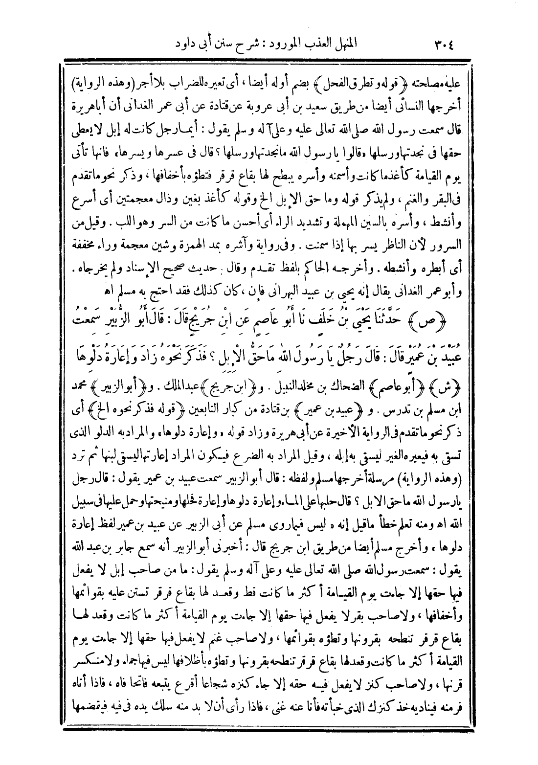 ومنه تعلم خطأ ما قيل إنه "ليس فيما روى مسلم عن أبي الزبير عن عبيد بن عمير لفظ إعارة دلوها" وأخرج مسلم أيضًا من طريق ابن جريج قال: أخبرني أبو الزبير أنه سمع جابر بن عبد الله يقول: سمعت رسول الله صلى الله تعالى عليه وعلى آله وسلم يقول: ما من صاحب إبل لا يفعل فيها حقها إلا جاءت يوم القيامة أكثر ما كانت قط وقعد لها بقاع قرقر تستن عليه بقوائمها وأخفافها, ولا صاحب بقر لا يفعل فيها حقها إلا جاءت يوم القيامة أكثر ما كانت وقعد لها بقاع قرقر تنطحه بقرونها وتطؤه بقوائمها, ولا صاحب غنم لا يفعل فيها حقها إلا جاءت يوم القيامة أكثر ما كانت وقعد لها بقاع قرقر تنطحه بقرونها وتطؤه بأظلافها ليس فيها جماء ولا منكسر قرنها, ولا صاحب كنز لا يفعل فيه حقه إلا جاء كنزه شجاعًا أقرع يتبعه فاتحًا فاه، فإذا أتاه فر منه فيناديه خذ كنزك الذي خبأته فأنا عنه غنى، فاذا رأى أن لا بد منه سلك يده في فيه فيقضمها