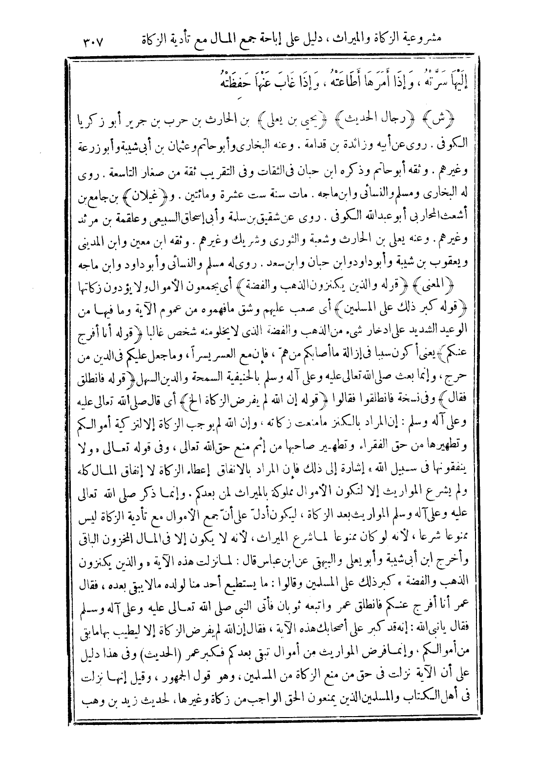 (قوله إن الله لم يفرض الزكاة الخ) أي قال صلى الله تعالى عليه وعلى آله وسلم: إن المراد بالكنز ما منعت زكاته، وإن الله لم يوجب الزكاة إلا لتزكية أموالكم وتطهيرها من حق الفقراء وتطهير صاحبها من إثم منع حق الله تعالى، وفي قوله تعالى (وَلَا يُنْفِقُونَهَا فِي سَبِيلِ اللَّهِ) إشارة إلى ذلك فإن المراد بالانفاق إعطاء الزكاة لا إنفاق المال كله ولم يشرع المواريث إلا لتكون الأموال مملوكة بالميراث لمن بعدكم. وإنما ذكر صلى الله تعالى عليه وعلى آله وسلم المواريث بعد الزكاة، ليكون أدلّ على أنّ جمع الأموال مع تأدية الزكاة ليس ممنوعًا شرعًا، لأنه لو كان ممنوعًا لما شرع مع الميراث, لأنه لا يكون إلا في المال المخزون الباقي وأخرج ابن أبي شيبة وأبو يعلى والبيهقي عن ابن عباس قال: لما نزلت هذه الآية (وَالَّذِينَ يَكْنِزُونَ الذَّهَبَ وَالْفِضَّةَ) كبر ذلك على المسلمين وقالوا: ما يستطيع أحد منا لولده مالًا يبقى بعده، فقال عمر أنا أفرج عنم فانطلق عمر واتبعه ثوبان فأتى النبي صلى الله تعالى عليه وعلى آله وسلم فقال يا نبي الله: إنه قد كبر على أصحابك هذه الآية، فقال إن الله لم يفرض الزكاة إلا ليطيب بها ما بقي من أموالكم، وإنما فرض المواريث من أموال تبقى بعدكم فكبر عمر