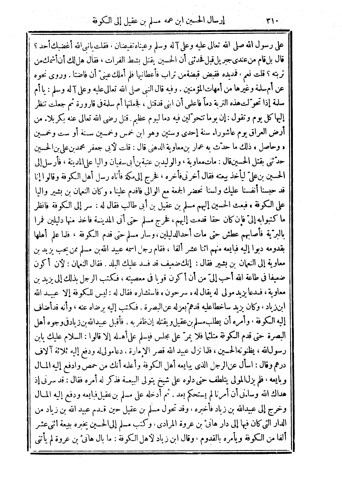 "وحاصل" ذلك ما حدّث به عمار بن معاوية الدهني قال: قال لأبي جعفر محمد بن علي بن الحسين حدّثني بقتل الحسين قال: مات معاوية، والوليد بن عتبة ابن أبي سفيان واليًا على المدينة، فأرسل إلى الحسين بن عليّ ليأخذ بيعته فقال أخرني فأخره، فخرج إلى مكة فأتاه رسل أهل الكوفة وقالوا إنا قد حبسنا أنفسنا عليك ولسنا نحضر الجمعة مع الوالي فاقدم علينا "وكان النعمان بن بشير واليًا علي الكوفة" فبعث الحسين إليهم مسلم بن عقيل بن أبي طالب فقال له: سر إلى الكوفة فانظر ما كتبوا به إليّ فإن كان حقًا قدمت إليهم، فخرج مسلم حتى أتى المدينة فأخذ منها دليلين فمرا بالبرّية فأصابهم عطش حتى مات أحد الدليلين، وسار مسلم حتى قدم الكوفة، فلما علم أهلها بقدومه دبوا إليه فبايعه منهم اثنا عشر ألفًا، فقام رجل اسمه عبد الله بن مسلم ممن يحب يزيد بن معاوية إلى النعمان بن بشير فقال: إنك ضعيف قد فسد عليك البلد. فقال النعمان: لأن أكون ضعيفًا في طاعة الله أحب إليّ من أن أكون قويًا في معصيته، فكتب الرجل بذلك إلى يزيد بن معاوية، فدعا يزيد مولى له يقال له "سرحون" فاستشاره فقال له: ليس للكوفة إلا عبيد الله ابن زياد، وكان يزيد ساخطًا عليه قد همّ بعزله عن البصرة، فكتب إليه برضاه عنه، وأنه قد أضاف إليه الكوفة، وأمره أن يطلب مسلم بن عقيل ويقتله إن ظفر به، فأقبل عبيد الله بن زياد في وجوه أهل البصرة حتى قدم الكوفة متلثمًا فلا يمرّ علي مجلس فيسلم على أهله إلا قالوا: السلام عليك يابن رسول الله، يظنونه الحسين، فلما نزل عبيد الله قصر الإمارة، دعا مولى له ودفع إليه ثلاثة آلاف درهم وقال: اسأل عن الرجل الذي يبايعه أهل الكوفة وأعلمه أنك من حمص وادفع إليه المال وبايعه، فلم يزل المولى يتلطف حتى دلوه علي شيخ يتولى البيعة فذكر له أمره فقال: قد سرني إذ هداك الله وساءني أن أمرنا لم يستحكم بعد. تم أدخله على مسلم بن عقيل فبايعه ودفع إليه المال وخرج إلى عبيد الله بن زياد فأخبره، وقد تحول مسلم بن عقيل حين قدم عبيد الله بن زياد من الدار التي كان فيها إلى دار هانئ بن عروة المرادي، وكتب مسلم إلى الحسين يخبره ببيعة اثنى عشر ألفًا من الكوفة ويأمره بالقدوم، وقال ابن زياد لأهل الكوفة: ما بال هانئ بن عروة لم يأتني