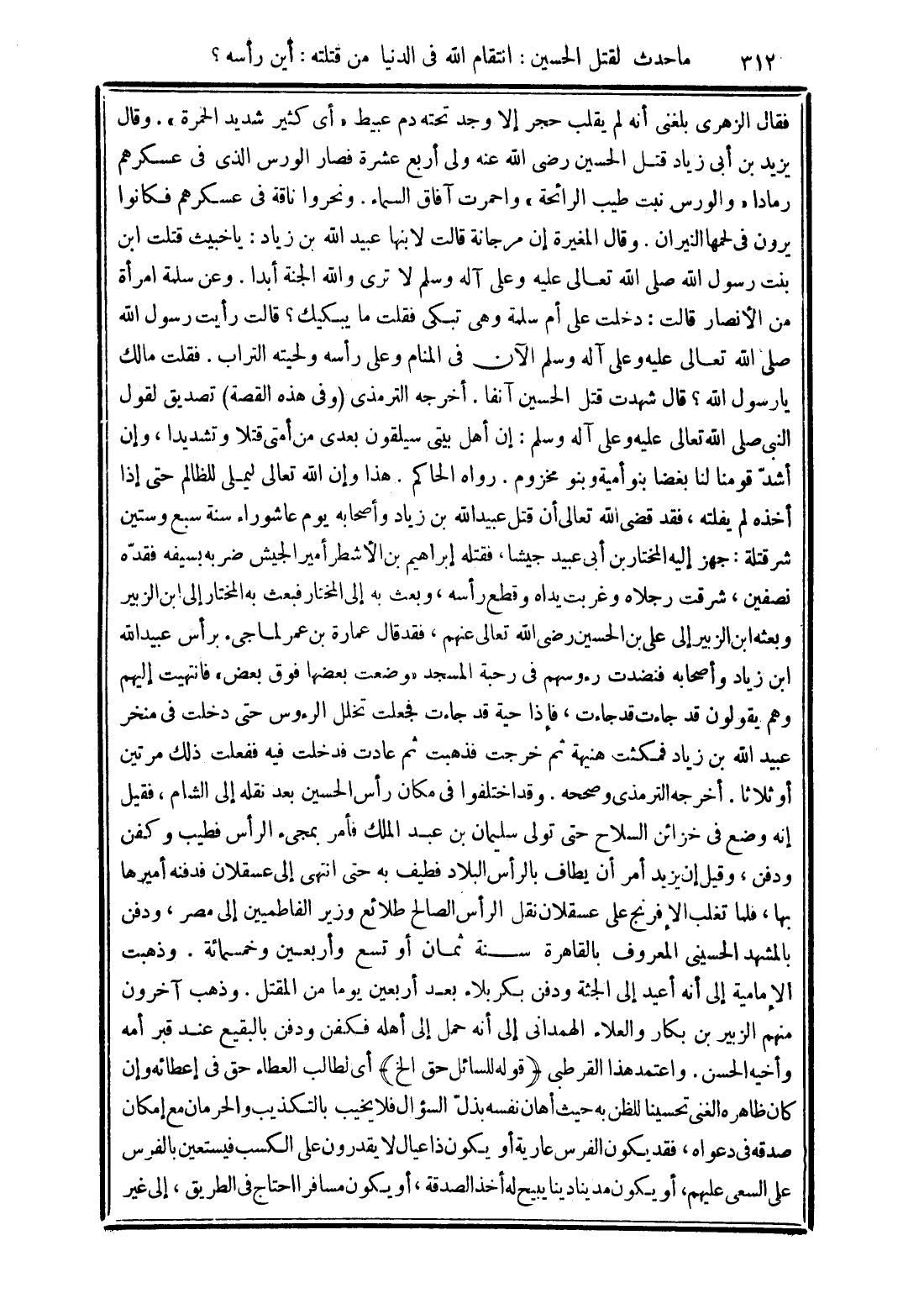 هذا وإن الله تعالى ليملي للظالم حتى إذا أخذه لم يفلته، فقد قضى الله تعالى أن قتل عبيد الله بن زياد وأصحابه يوم عاشوراء سنة سبع وستين شر قتلة: جهز إليه المختار بن أبي عبيد جيشًا، فقتله إبراهيم بن الأشطر أمير الجيش ضربه بسيفه فقدّه نصفين، شرقت رجلاه وغربت يداه وقطع رأسه، وبعث به إلى المختار فبعث به المختار إلى ابن الزبير وبعثه الزبير إلى علي بن الحسين رضي الله تعالى عنهم، فقد قال عمارة بن عمر لما جيء برأس عبيد الله ابن زياد وأصحابه فنضدت رءوسهم في رحبة المسجد "وضعت بعضها فوق بعض" فانتهيت إليهم وهم، يقولون قد جاءت قد جاءت، فإذا حية قد جاءت فجعلت تخلل الرءوس حتى دخلت في منخر عبيد الله بن زياد فمكثت هنيهة ثم خرجت فذهبت ثم عادت فدخلت فيه ففعلت ذلك مرتين أو ثلاثًا. أخرجه الترمذي وصححه.