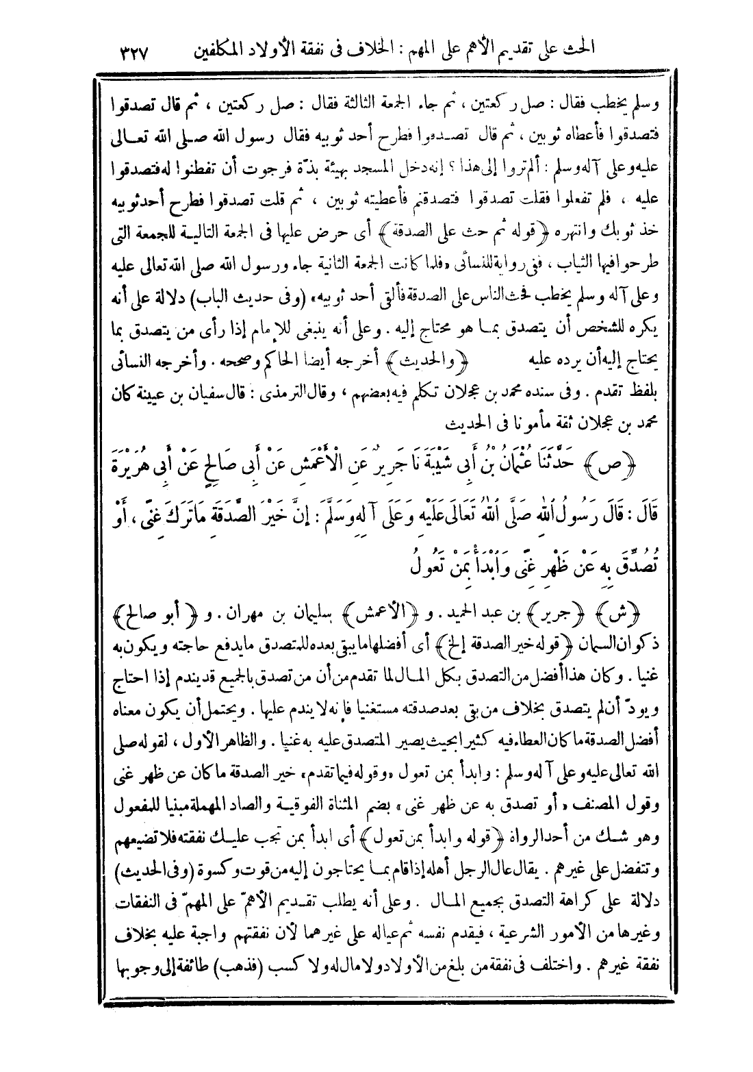 (ص) حَدَّثَنَا عُثْمَانُ بْنُ أَبِي شَيْبَةَ نَا جَرِيرٌ عَنِ الأَعْمَشِ عَنْ أَبِي صَالِحٍ عَنْ أَبِي هُرَيْرَةَ قَالَ قَالَ رَسُولُ اللَّهِ -صَلَّى الله تَعَالَى عَلَيْهِ وَعَلَى آلِهِ وَسَلَّمَ- "إِنَّ خَيْرَ الصَّدَقَةِ مَا تَرَكَ غِنًى أَوْ تُصُدِّقَ بِهِ عَنْ ظَهْرِ غِنًى وَابْدَأْ بِمَنْ تَعُولُ".