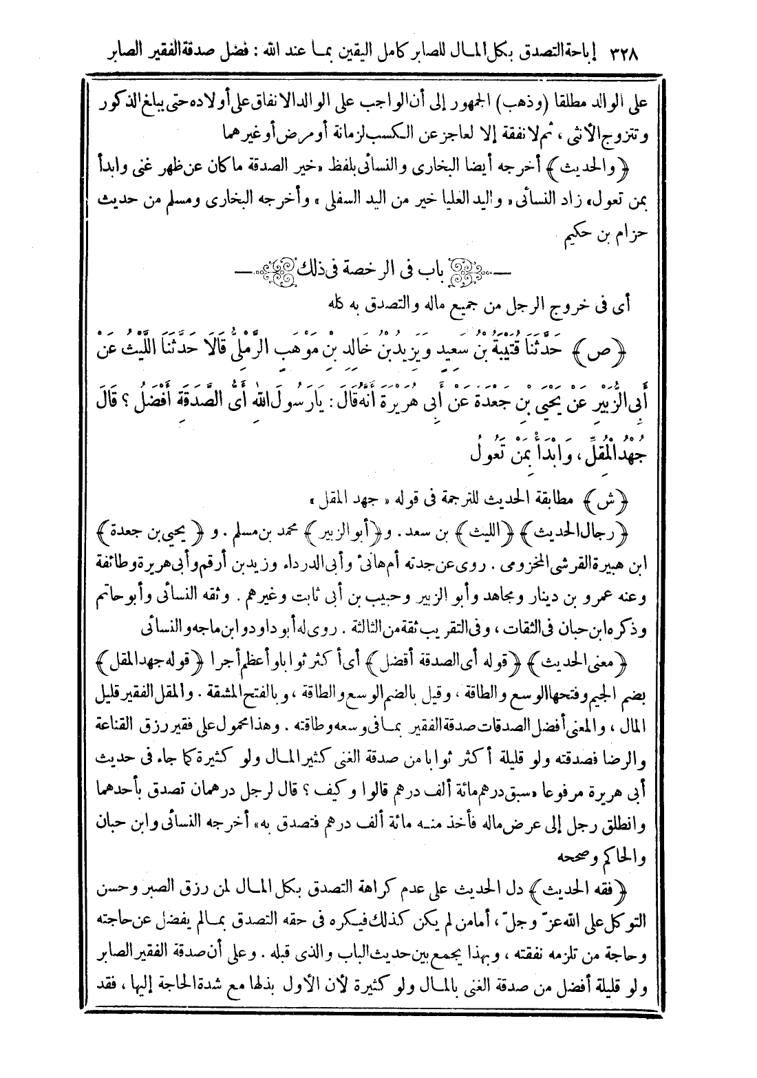 (فقه الحديث) دل الحديث على عدم كراهة التصدق بكل المال لمن رزق الصبر وحسن التوكل علي الله عَزَّ وَجَلَّ، أما من لم يكن كذلك فيكره في حقه التصدق بما لم يفضل عن حاجته وحاجة من تلزمه نفقته، وبهذا يجمع بين حديث الباب والذي قبله. وعلى أن صدقة الفقير الصابر ولو قليلة أفضل من صدقة الغني بالمال ولو كثيرة لأن الأول بذلهاخ شدة الحاجة إليها، فقد
