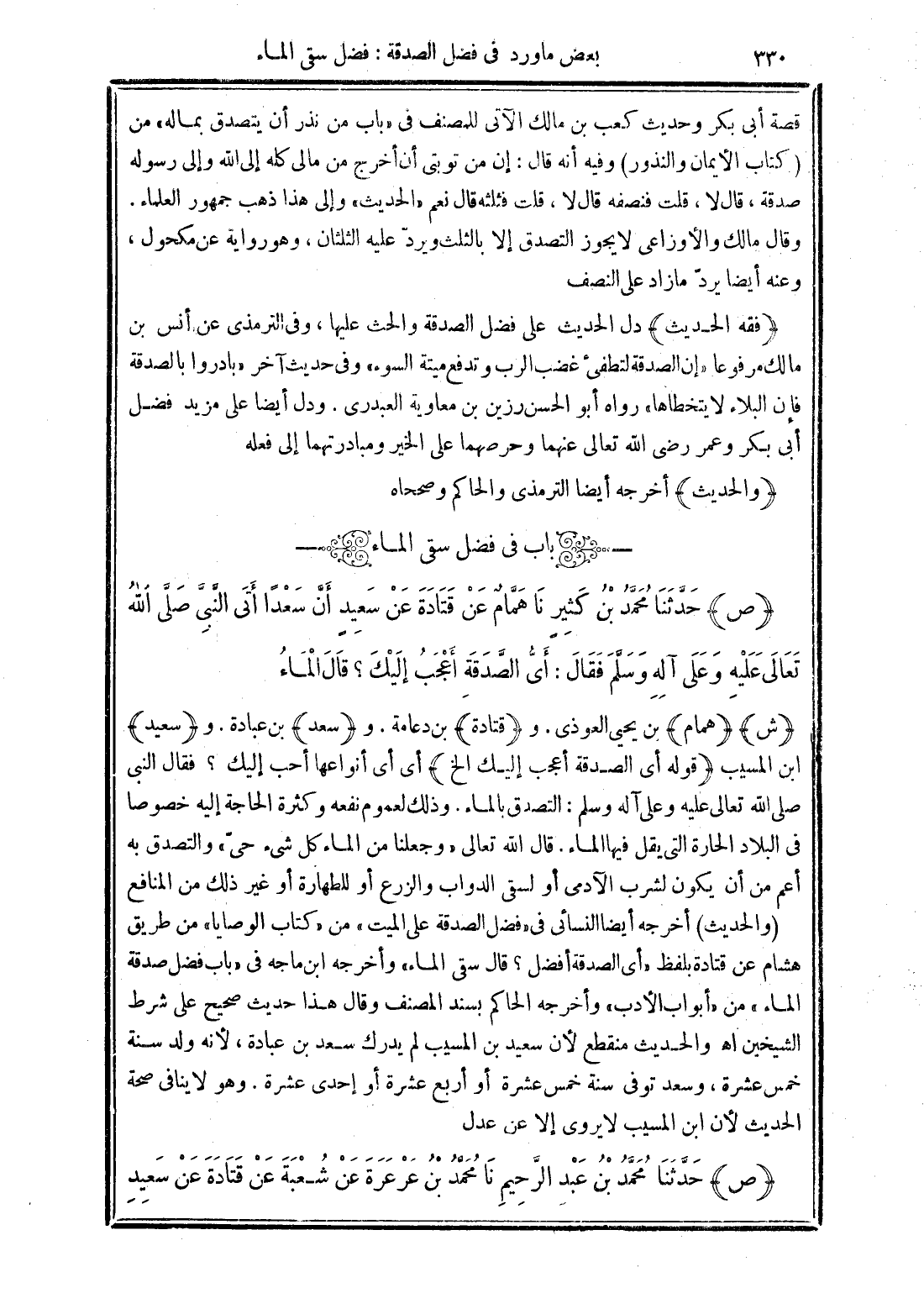(ص) حَدَّثَنَا مُحَمَّدُ بْنُ كَثِيرٍ أَنَا هَمَّامٌ عَنْ قَتَادَةَ عَنْ سَعِيدٍ أَنَّ سَعْدًا أَتَى النَّبِيَّ -صَلَّى الله تَعَالَى عَلَيْهِ وَعَلَى آلِهِ وَسَلَّمَ- فَقَالَ أَيُّ الصَّدَقَةِ أَعْجَبُ إِلَيْكَ قَالَ "الْمَاءُ".
