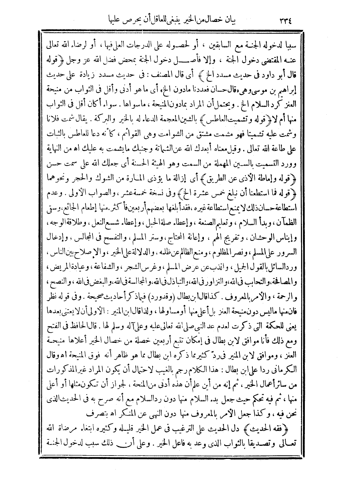 قال الحافظ في الفتح ومع ذلك فأنا موافق لابن بطال في إمكان تتبع أربعين خصلة من خصال الخير أعلاها منيحة العنز، وموافق لابن المنير في ردّ كثير مما ذكره ابن بطال مما هو ظاهر أنه فوق المنيحة اهـ