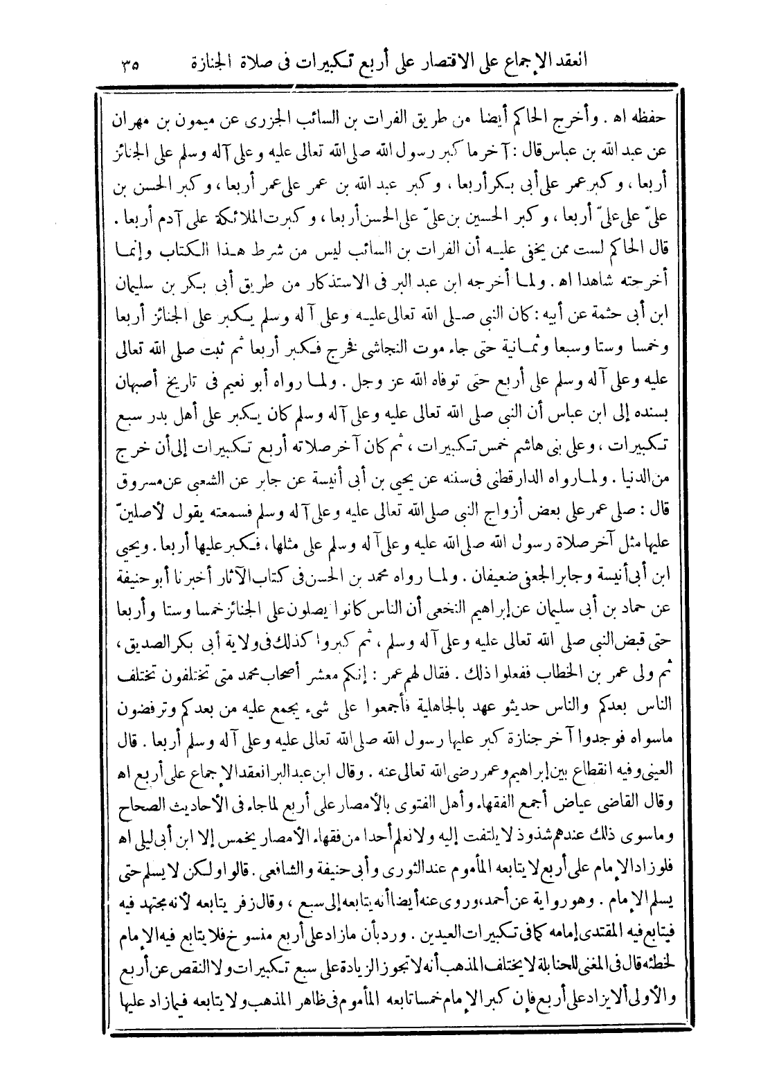 ولما رواه محمَّد بن الحسن في كتاب الآثار أخبرنا أبو حنيفة عن حماد بن أبي سليمان عن إبراهيم النخعي أن الناس كانوا يصلون على الجنائز خمسًا وستًا وأربعًا حتى قبض النبي صلى الله تعالى عليه وعلى آله وسلم، ثم كبروا كذلك في ولاية أبي بكر الصديق، ثم ولي عمر بن الخطاب ففعلوا ذلك. فقال لهم عمر: إنكم معشر أصحاب محمَّد متى تختلفون تختلف الناس بعدكم والناس حديثو عهد بالجاهلية فأجمعوا على شيء يجمع عليه من بعدكم وترفضون ما سواه فوجدوا آخر جنازة كبر عليها رسول الله صلى الله تعالى عليه وعلى آله وسلم أربعًا. قال العيني وفيه انقطاع بين إبراهيم وعمر رضي الله تعالى عنه. وقال ابن عبد البر انعقد الإجماع على أربع اهـ