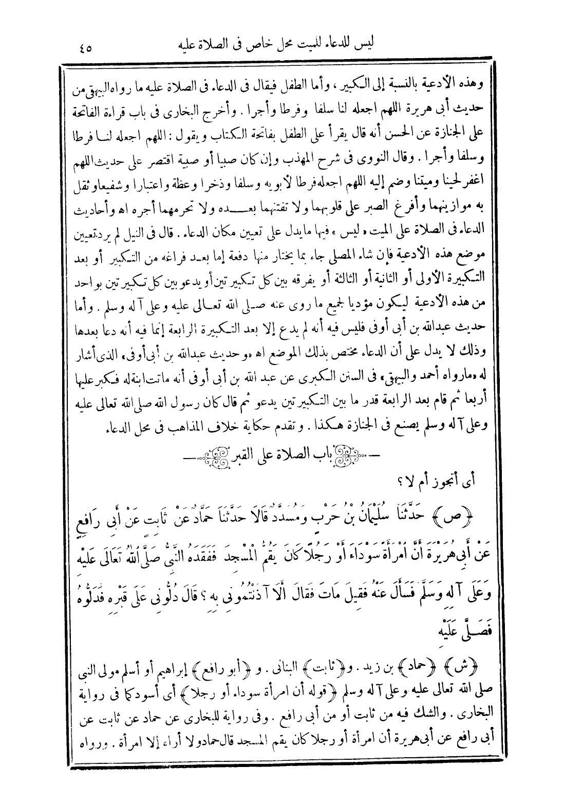وهذه الأدعية بالنسبة إلى الكبير، وأما الطفل فيقال في الدعاء في الصلاة عليه ما رواه البيهقي من حديث أبي هريرة اللهم اجعله لنا سلفًا وفرطًا وأجرًا. وأخرج البخاري في باب قراءة الفاتحة على الجنازة عن الحسن أنه قال يقرأ على الطفل بفاتحة الكتاب ويقول: اللهم اجعله لنا فرطًا وسلفًا وأجرًا.