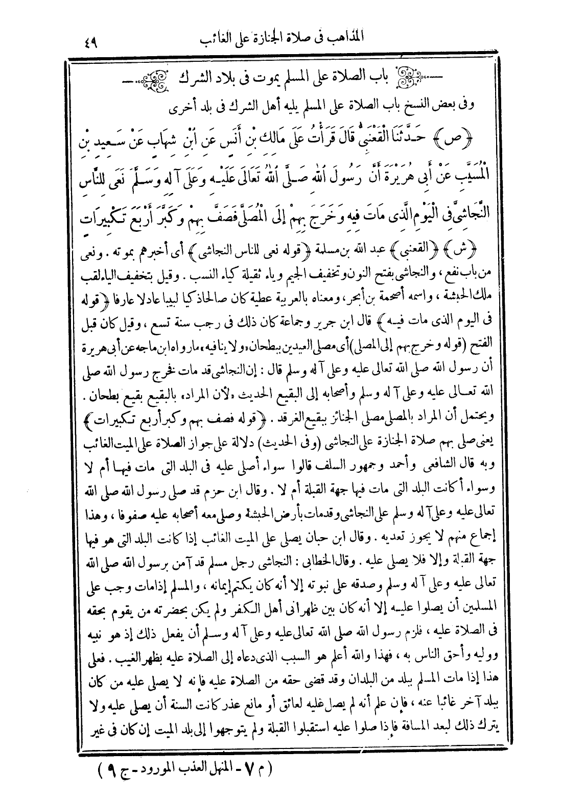 وقال الخطابي: النجاشي رجل مسلم قد آمن برسول الله صلى الله تعالى عليه وعلى آله وسلم وصدقه على نبوته إلا أنه كان يكتم إيمانه، والمسلم إذا مات وجب على المسلمين أن يصلوا عليه إلا أنه كان بين ظهراني أهل الكفر ولم يكن بحضرته من يقوم بحقه في الصلاة عليه، فلزم رسول الله صلى الله تعالى عليه وعلى آله وسلم أن يفعل ذلك إذ هو نبيه ووليه وأحق الناس به، فهذا والله أعلم هو السبب الذي دعاه إلى الصلاة عليه بظهر الغيب. فِعلى هذا إذا مات المسلم ببلد من البلدان وقد قضى حقه من الصلاة عليه فإنه لا يصلي عليه من كان ببلد آخر غائبًا عنه، فإن علم أنه لم يصل عليه لعائق أو مانع أو عذر كانت السنة أن يصلي عليه ولا يترك ذلك لبعد المسافة فإذا صلوا عليه استقبلوا القبلة ولم يتوجهوا إلى بلد الميت إن كان في غير