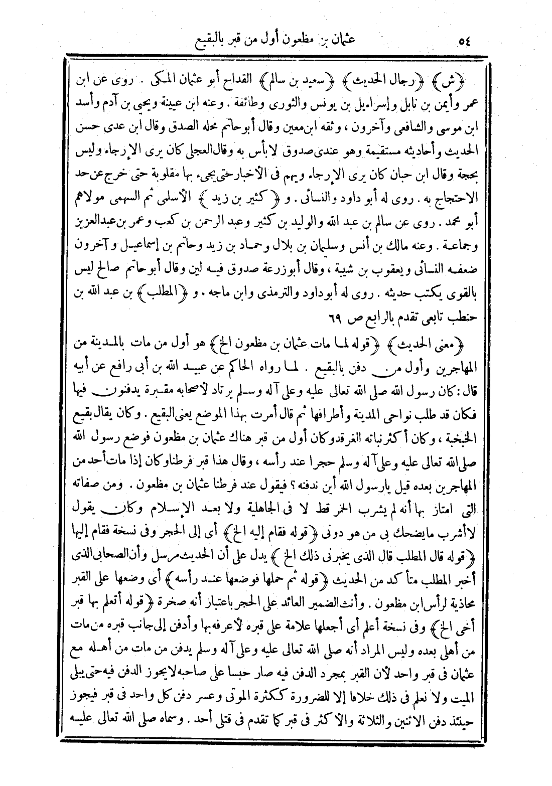 (ش) (رجال الحديث) (سعيد بن سالم) القداح أبو عثمان المكي. روى عن ابن عمر وأيمن بن نابل وإسراءيل بن يونس والثوري وطائفة. وعنه ابن عيينة ويحيى بن آدم وأسد ابن موسى والشافعي وآخرون، وثقه ابن معين وقال أبو حاتم محله الصدق وقال ابن عدي حسن الحديث وأحاديثه مستقيمة وهو عندي صدوق لا بأس به وقال العجلي كان يرى الإرجاء وليس بحجة. وقال ابن حبان كان يرى الإرجاء ويهم في الأخبار حتى يجئ بها مقلوبة حتى خرج عن حد الاحتجاج به. روى له أبو داود والنسائي. و (كثير بن زيد) الأسلمي ثم السهمى مولاهم أبو محمَّد. روى عن سالم بن عبد الله والوليد بن كثير وعبد الرحمن بن كعب وعمر بن عبد العزيز وجماعة. وعنه مالك بن أنس وسلمان بن بلال وحماد بن زيد وحاتم بن إسماعيل وآخرون ضعفه النسائي ويعقوب بن شيبة، وقال أبو زرعة صدوق فيه لين وقال أبو حاتم صالح ليس بالقوي يكتب حديثه. روى له أبو داود والترمذي وابن ماجه. و (المطلب) بن عبد الله بن حنطب تابعي تقدم بالرابع ص 69