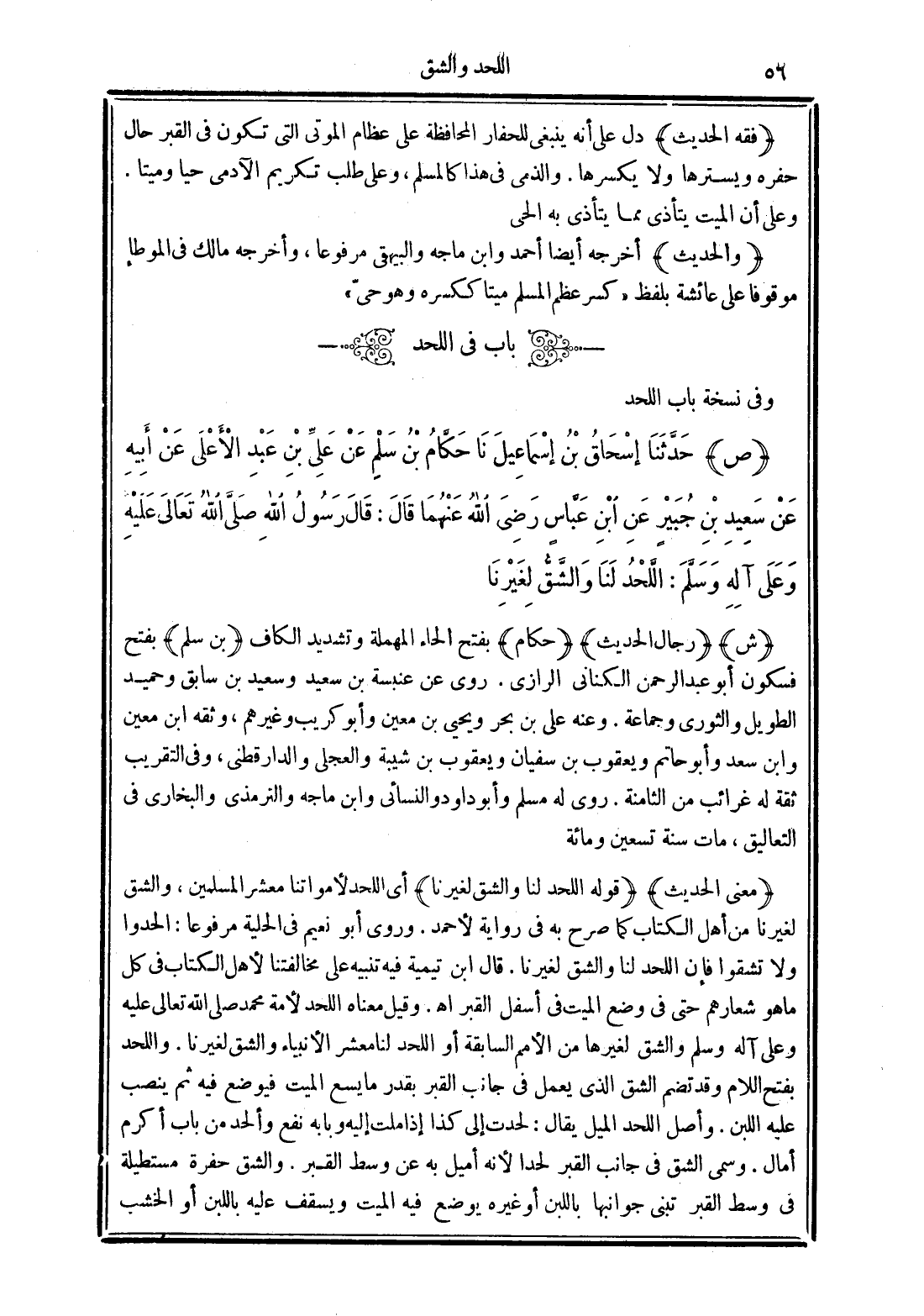 (ص) حَدَّثَنَا إِسْحَاقُ بْنُ إِسْمَاعِيلَ نَا حَكَّامُ بْنُ سَلْمٍ عَنْ عَلِيِّ بْنِ عَبْدِ الأَعْلَى عَنْ أَبِيهِ عَنْ سَعِيدِ بْنِ جُبَيْرٍ عَنِ ابْنِ عَبَّاسٍ قَالَ قَالَ رَسُولُ اللَّهِ -صَلَّى الله تَعَالَى عَلَيْهِ وَعَلَى آلِهِ وَسَلَّمَ- "اللَّحْدُ لَنَا وَالشَّقُّ لِغَيْرِنَا".