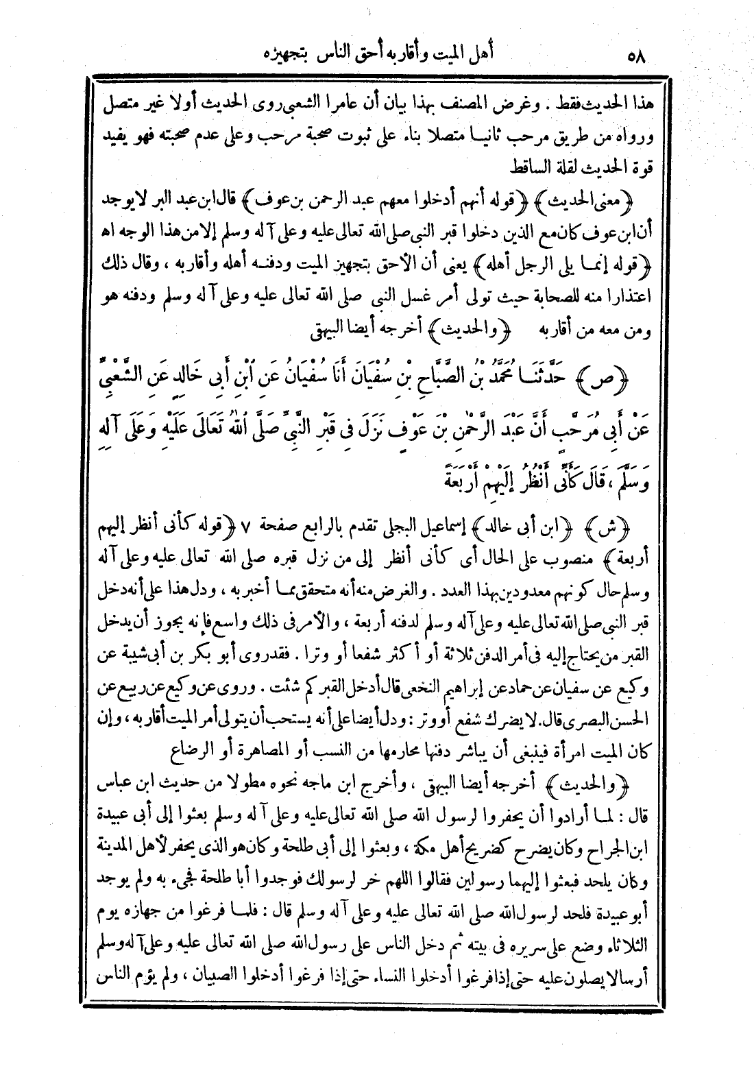 (ص) حَدَّثَنَا مُحَمَّدُ بْنُ الصَّبَّاحِ أَنَا سُفْيَانُ عَنِ ابْنِ خَالِدٍ عَنِ الشَّعْبِيِّ عَنْ أَبِي مُرَحَّبٍ أَنَّ عَبْدَ الرَّحْمَنِ بْنَ عَوْفٍ نَزَلَ فِي قَبْرِ النَّبِيِّ -صَلَّى الله تَعَالَى عَلَيْهِ وَعَلَى آلِهِ وَسَلَّمَ- قَالَ كَأَنِّي أَنْظُرُ إِلَيْهِمْ أَرْبَعَةً.