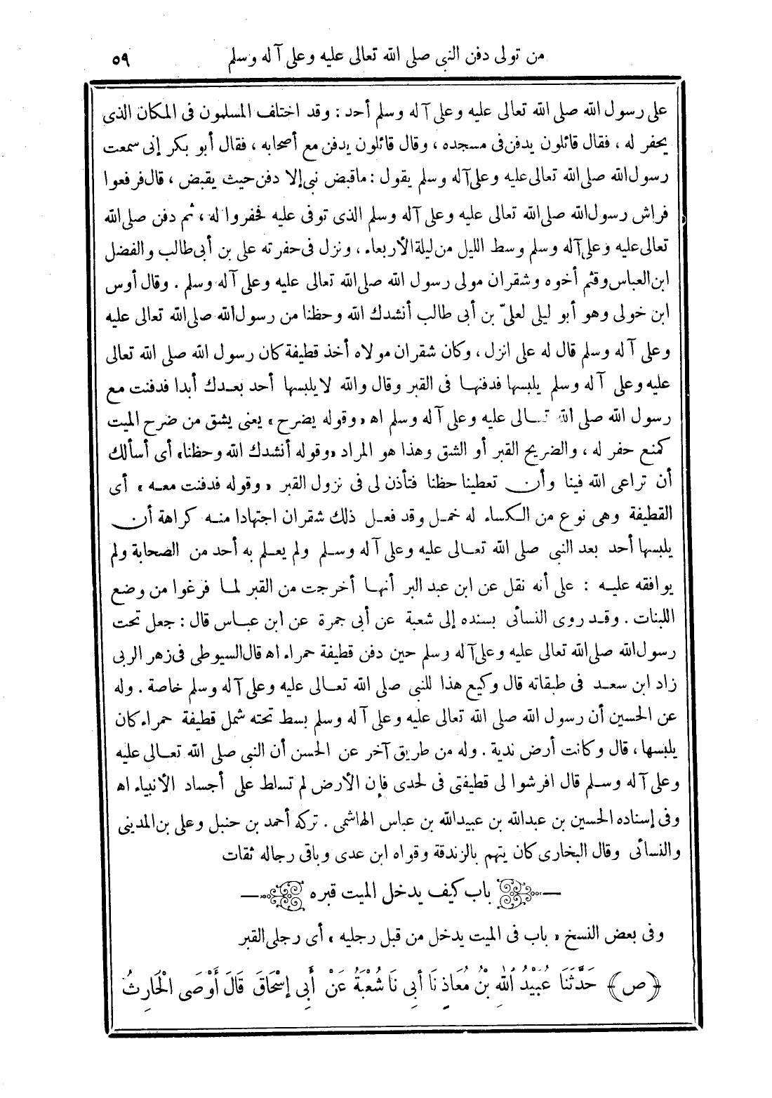 وقد اختلف المسلمون في المكان الذي يحفر له، فقال قائلون يدفن في مسجده، وقال قائلون يدفن مع أصحابه، فقال أبو بكر إني سمعت رسول الله صلى الله تعالى عليه وعلى آله وسلم يقول: ما قبض نبي إلا دفن حيث يقبض، قال فرفعوا فراش رسول الله صلى الله تعالى عليه وعلى آله وسلم الذي توفي عليه فحفروا له، ثم دفن صلى الله تعالى عليه وعلى آله وسلم وسط الليل من ليلة الأربعاء، ونزل في حفرته علي بن أبي طالب والفضل ابن العباس وقثم أخوه وشقران مولى رسول الله صلى الله تعالى عليه وعلى آله وسلم. وقال أوس ابن خولى وهو أبو ليلى لعلىّ بن أبي طالب أنشدك الله وحظنا من رسول الله صلى الله تعالى عليه وعلى آله وسلم قال له علي انزل، وكان شقران مولاه أخذ قطيفة كان رسول الله صلى الله تعالى عليه وعلى آله وسلم يلبسها فدفنها في القبر وقال والله لا يلبسها أحد بعدك أبدًا فدفنت مع رسول الله صلى الله تعالى عليه وعلى آله وسلم اهـ