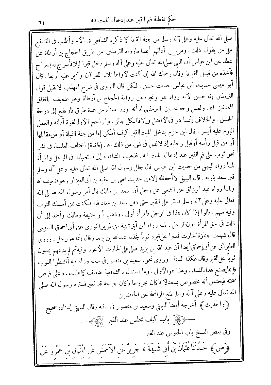 (فائدة) اختلف العلماء في نشر نحو ثوب على فم القبر عند إدخال الميت فيه. فذهبت الشافعية إلى استحبابه في الرجل والمرأة لما رواه البيهقي من حديث ابن عباس قال جلل رسول الله صلى الله تعالى عليه وعلى آله وسلم قبر سعد بثوبه. قال البيهقي لا أحفظه إلا من حديث يحيى بن عقبة بن أبي العيزار وهو ضعيف اهـ