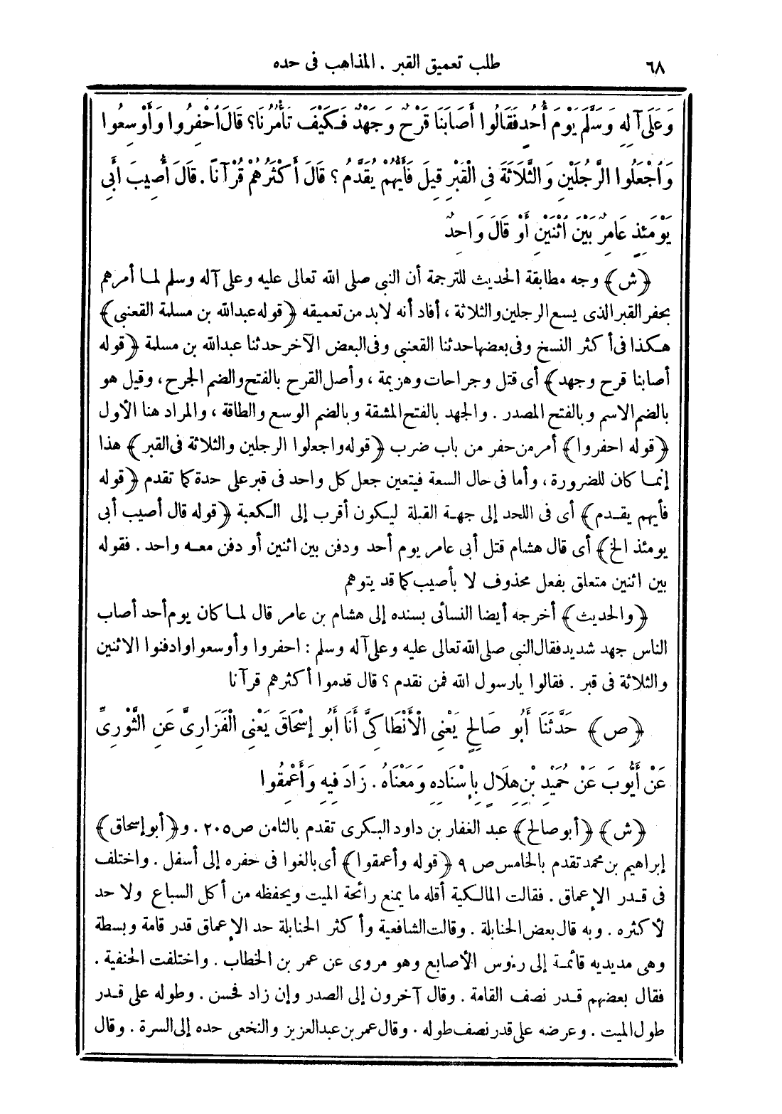 (والحديث) أخرجه أيضًا النسائي بسنده إلى هشام بن عامر قال لما كان يوم أحد أصاب الناس جهد شديد فقال النبي صلى الله تعالى عليه وعلى آله وسلم: احفروا وأوسعوا وادفنوا الاثنين والثلاثة في قبر. فقالوا يا رسول الله فمن تقدم؟ قال قدموا أكثرهم قرآنًا