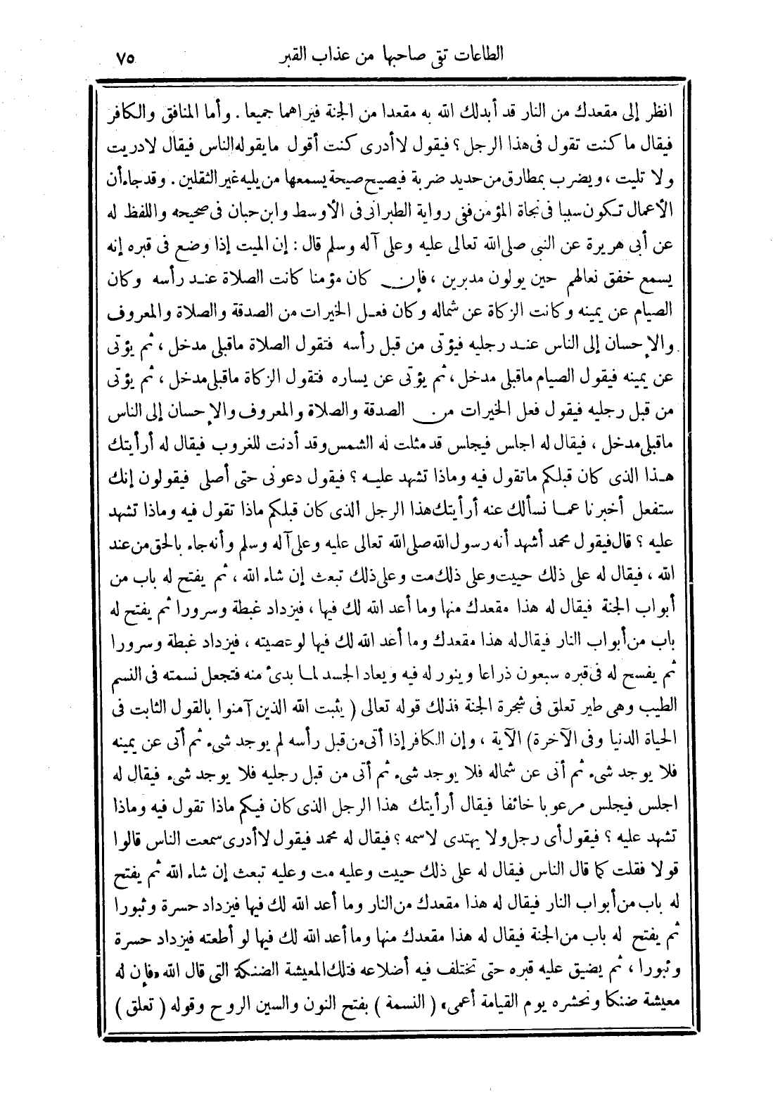 وقد جاء أن الأعمال تكون سببًا في نجاة المؤمن ففي رواية الطبراني الأوسط وابن حبان في صحيحه واللفظ له عن أبي هريرة عن النبي صلى الله تعالى عليه وعلى آله وسلم قال: إن الميت إذا وضع في قبره إنه يسمع خفق نعالهم حين يولون مدبرين، فإن كان مؤمنًا كانت الصلاة عند رأسه وكان الصيام عن يمينه وكانت الزكاة عن شماله وكان فعل الخيرات من الصدقة والصلاة والمعروف والإحسان إلى الناس عند رجليه فيؤتى من قبل رأسه فتقول الصلاة ما قبلي مدخل، ثم يؤتى عن يمينه فيقول الصيام ما قبلي مدخل، ثم يؤتى عن يساره فتقول الزكاة ما قبلي مدخل، ثم يؤتى من قبل رجليه فيقول فعل الخيرات من الصدقة والصلاة والمعروف والإحسان إلى الناس ما قبلي مدخل، فيقال له اجلس فيجلس قد مثلت له الشمس وقد أدنت للغروب فيقال له أرأيتك هذا الذي كان قبلكم ما تقول فيه وماذا تشهد عليه؟ فيقول دعوني حتى أصلي فيقولون إنك ستفعل أخبرنا عما نسألك عنه أرأيتك هذا الرجل الذي كان قبلكم ماذا تقول فيه وماذا تشهد عليه؟ قال فيقول محمَّد أشهد أنه رسول الله صلى الله تعالى عليه وعلى آله وسلم وأنه جاء بالحق من عند الله، فيقال له على ذلك حييت وعلى ذلك مت وعلى ذلك تبعث إن شاء الله، ثم يفتح له باب من أبواب الجنة فيقال له هذا مقعدك منها وما أعد الله لك فيها، فيزداد غبطة وسرورًا ثم يفتح له باب من أبواب النار فيقال له هذا مقعدك وما أعد الله لك فيها لو عصيته، فيزداد غبطة وسرورًا ثم يفسح له في قبره سبعون ذراعًا وينور له فيه ويعاد الجسد لما بدئ منه فتجعل نسمته في النسم الطيب وهي طير تعلق في شجرة الجنة فذلك قوله تعالى (يثبت الله الذين آمنوا بالقول الثابت في الحياة الدنيا وفي الآخرة) الآية،