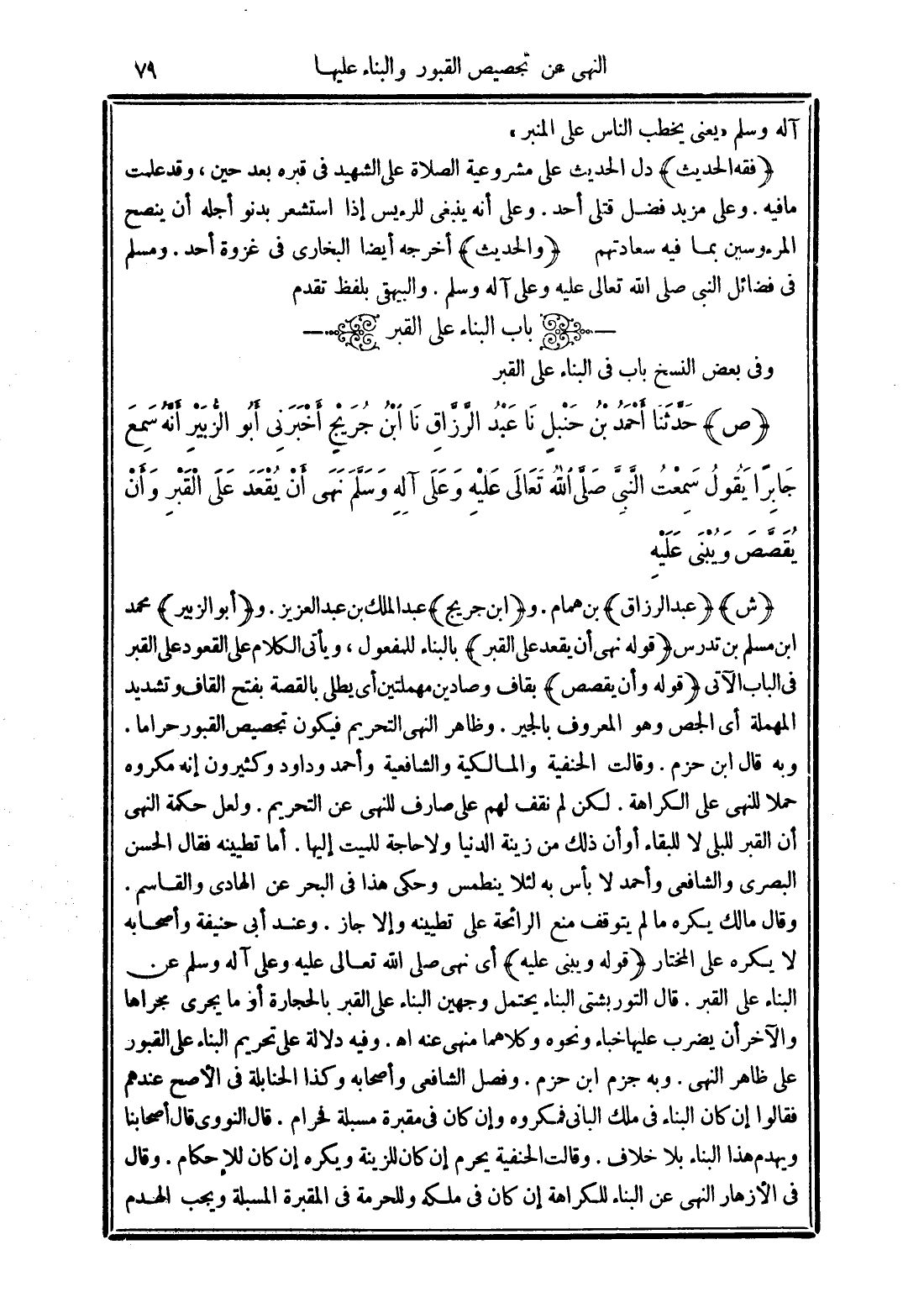وفيه دلالة على تحريم البناء على القبور على ظاهر النهي. وبه جزم ابن حزم. وفصل الشافعي وأصحابه وكذا الحنابلة في الأصح عندهم فقالوا إن كان البناء في ملك الباني فمكروه وإن كان في مقبرة مسبلة فحرام. قال النووي قال أصحابنا ويهدم هذا البناء بلا خلاف. وقالت الحنفية يحرم إن كان للزينة ويكره إن كان للإحكام. وقال في الأزهار النهي عن البناء للكراهة إن كان في ملكه وللحرمة في المقبرة المسبلة ويجب الهدم