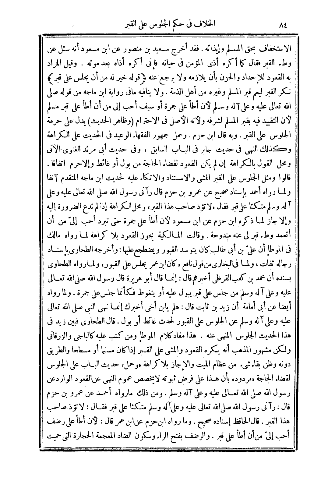 قال الطحاوي فبين زيد في هذا الحديث الجلوس المنهي عنه. هذا مفاد كلام الموطإ ومن كتب عليه كالباجي والزرقاني ولكن مشهور المذهب أنه يكره القعود والمشي علي القبر إذا كان مسنمًا أو مسطحًا والطريق دونه وظن بقاء شيء من عظام الميت والإجاز بلا كراهة "وحمل" حديث الباب على الجلوس لقضاء الحاجة "مردود" بأن هذا على فرض ثبوته لا يخصص عموم النهي عن القعود الوارد عن رسول الله صلي الله تعالى عليه وعلى آله وسلم. ومن ذلك ما رواه أحمد عن عمرو بن حزم قال: رآني رسول الله صلى الله تعالى عليه وعلى آله وسلم متكئًا على قبر فقال: لا تؤذ صاحب هذا القبر. قال الحافظ إسناده صحيح. وما رواه ابن حزم عن ابن عمر قال: لأن أطأ على رضف أحب إليّ من أن أطأ على قبر. والرضف بفتح الراء وسكون الضاد المعجمة الحجارة التي حميت