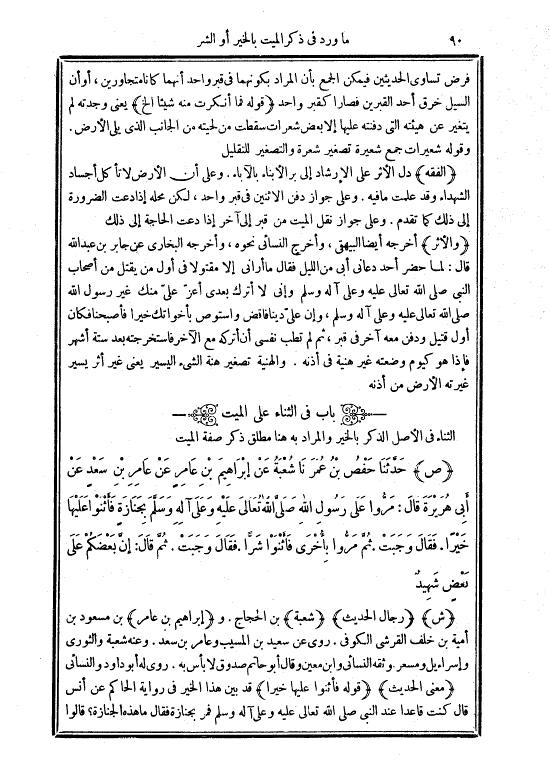 (ص) حَدَّثَنَا حَفْصُ بْنُ عُمَرَ نَا شُعْبَةُ عَنْ إِبْرَاهِيمَ بْنِ عَامِرٍ عَنْ عَامِرِ بْنِ سَعْدٍ عَنْ أَبِي هُرَيْرَةَ قَالَ مَرُّوا عَلَى رَسُولِ اللَّهِ -صَلَّى الله تَعَالَى عَلَيْهِ وَعَلَى آلِهِ وَسَلَّمَ- بِجَنَازَةٍ فَأَثْنَوْا عَلَيْهَا خَيْرًا فَقَالَ "وَجَبَتْ". ثُمَّ مَرُّوا بِأُخْرَى فَأَثْنَوْا عَلَيْهَا شَرًّا فَقَالَ "وَجَبَتْ". ثُمَّ قَالَ "إِنَّ بَعْضَكُمْ عَلَى بَعْضٍ شَهِيد".