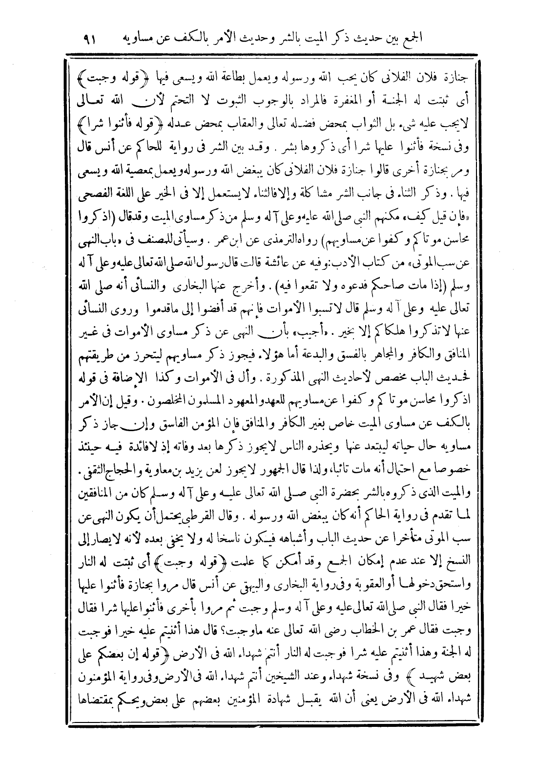 "أجيب" بأن النهي عن ذكر مساوي الأموات في غير المنافق والكافر والمجاهر بالفسق والبدعة أما هؤلاء فيجوز ذكر مساويهم ليتحرز من طريقتهم فحديث الباب مخصص لأحاديث النهي المذكورة. وأل في الأموات وكذا الإضافة في قوله اذكروا محاسن موتا كم وكفوا عن مساويهم للعهد والمعهود المسلمون المخلصون. وقيل إن الأمر بالكف عن مساوي الميت خاص بغير الكافر والمنافق فإن المؤمن الفاسق وإن جاز ذكر مساويه حال حياته ليبتعد عنها ويحذره الناس لا يجوز ذكرها بعد وفاته إذ لا فائدة فيه حينئذ خصوصًا مع احتمال أنه مات تائبًا, ولذا قال الجمهور لا يجوز لعن يزيد بن معاوية والحجاج الثقفي. والميت الذي ذكروه بالشر بحضرة النبي صلي الله تعالى عليه وعلى آله وسلم كان من المنافقين لما تقدم في رواية الحاكم أنه كان يبغض الله ورسوله. وقال القرطبي يحتمل أن يكون النهي عن سب الموتى متأخرًا عن حديث الباب وأشباهه فيكون ناسخًا له ولا يخفى بعده لأنه لا يصار إلى النسخ إلا عند عدم إمكان الجمع وقد أمكن كما علمت
