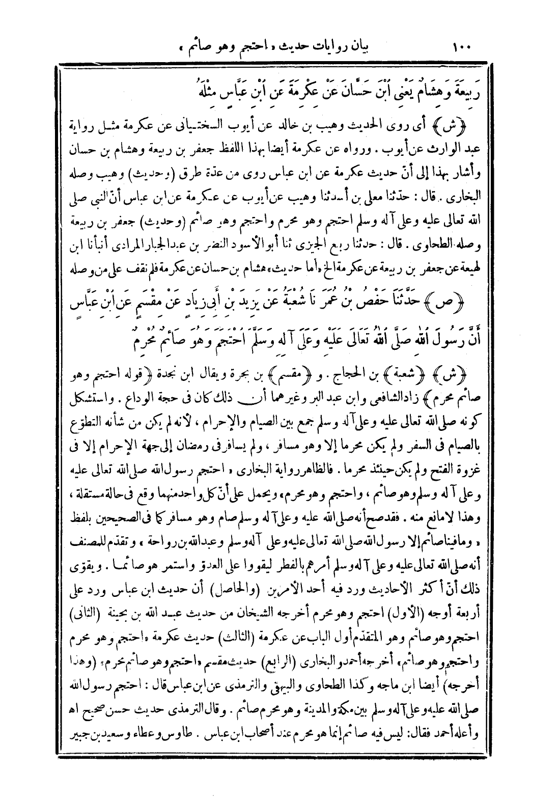(قوله احتجم وهو صائم محرم) زاد الشافعى وابن عبد البر وغيرهما أن ذلك كان فى حجة الوداع. واستشكل كونه صلى الله تعالى عليه وعلى آله وسلم جمع بين الصيام والإحرام، لأنه لم يكن من شأنه التطوّع بالصيام فى السفر ولم يكن محرما إلا وهو مسافر، ولم يسافر فى رمضان إلى جهة الإحرام إلا فى غزوة الفتح ولم يكن حينئذ محرما. فالظاهر رواية البخارى "احتجم رسول الله صلى الله تعالى عليه وعلى آله وسلم وهو صائم، واحتجم وهو محرم" ويحمل على أنّ كل واحد منهما وقع فى حالة مستقلة، وهذا لا مانع منه. فقد صح أنه صلى الله عليه وعلى آله وسلم صام وهو مسافر كما فى الصحيحين بلفظ "وما فينا صائم إلا رسول الله صلى الله تعالى عليه وعلى آله وسلم وعبد الله بن رواحة" وتقدّم للمصنف أنه صلى الله تعالى عليه وعلى آله وسلم أمرهم بالفطر ليقووا على العدوّ واستمر هو صائما. ويقوّى ذلك أنّ أكثر الأحاديث ورد فيه أحد الأمرين (والحاصل) أن حديث ابن عباس ورد على أربعة أوجه (الأول) احتجم وهو محرم أخرجه الشيخان من حديث عبد الله بن بحينة (الثانى) احتجم وهو صائم وهو المتقدّم أول الباب عن عكرمة (الثالث) حديث عكرمة "احتجم وهو محرم واحتجم وهو صائم، أخرجه أحمد والبخارى (الرابع) حديث مقسم "احتجم وهو صائم محرم" (وهذا أخرجه) أيضا ابن ماجه وكذا الطحاوى والبيهقى والترمذى عن ابن عباس قال: احتجم رسول الله صلى الله عليه وعلى آله وسلم بين مكة والمدينة وهو محرم صائم. وقال الترمذى حديث حسن صحيح اهـ وأعله أحمد فقال: ليس فيه صائم إنما هو محرم عند أصحاب ابن عباس. طاوس وعطاء وسعيد بن جبير