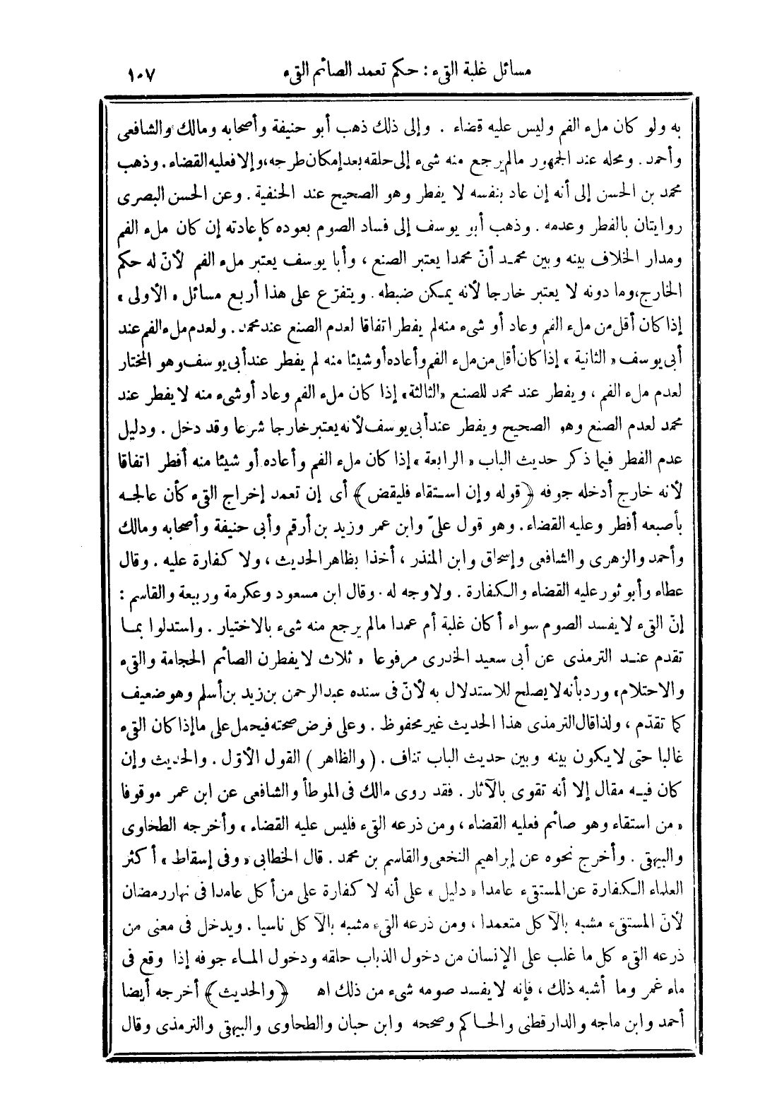 به ولو كان ملء الفم وليس عليه قضاء. وإلى ذلك ذهب أبو حنيفة وأصحابه ومالك والشافعي وأحمد. ومحله عند الجمهور ما لم يرجع منه شئ إلى حلقه بعد إمكان طرحه، وإلا فعليه القضاء. وذهب محمد بن الحسن إلى أنه إن عاد بنفسه لا يفطر وهو الصحيح عند الحنفية. وعن الحسن البصرى روايتان بالفطر وعدمه. وذهب أبو يوسف إلى فساد الصوم بعوده كإعادته إن كان ملء الفم ومدار الخلاف بينه وبين محمد أنّ محمدا يعتبر الصنع، وأبا يوسف يعتبر ملء الفم لأنّ له حكم الخارج، وما دونه لا يعتبر خارجا لأنه يمكن ضبطه. ويتفرّع على هذا أربع مسائل "الأولى" إذا كان أقل من ملء الفم وعاد أو شئ منه لم يفطر اتفاقا لعدم الصنع عند محمد. ولعدم ملء الفم عند أبي يوسف "الثانية" إذا كان أقل من ملء الفم وأعاده أو شيئا منه لم يفطر عند أبى يوسف وهو المختار لعدم ملء الفم، ويفطر عند محمد للصنع "الثالثة" إذا كان ملء الفم وعاد أو شئ منه لا يفطر عند محمد لعدم الصنع وهو الصحيح ويفطر عند أبى يوسف لأنه يعتبر خارجا شرعا وقد دخل. ودليل عدم الفطر فيما ذكر حديث الباب "الرابعة" إذا كان ملء الفم وأعاده أو شيئا منه أفطر اتفاقا لأنه خارج أدخله جوفه