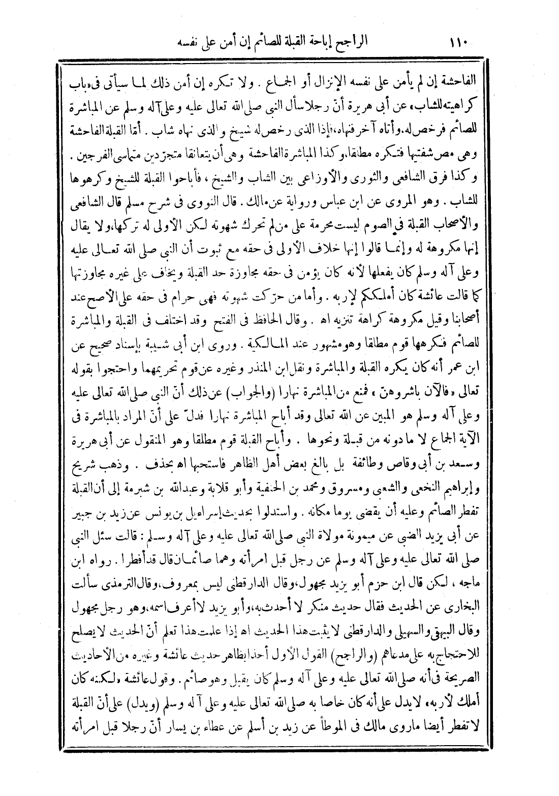 الفاحشة إن لم يأمن على نفسه الإنزال أو الجماع. ولا تكره إن أمن ذلك لما سيأتى فى "باب كراهيته للشاب" عن أبي هريرة أنّ رجلا سأل النبى صلى الله تعالى عليه وعلى آله وسلم عن المباشرة للصائم فرخص له. وأتاه آخر فنهاه، فإذا الذى رخص له شيخ والذي نهاه شاب. أمّا القبلة الفاحشة وهي مص شفتيها فتكره مطلقا، وكذا المباشرة الفاحشة وهى أن يتعانقا متجردين متماسى الفرجين. وكذا فرق الشافعى والثورى والأوزاعى بين الشاب والشيخ، فأباحوا القبلة للشيخ وكرهوها للشاب. وهو المروى عن ابن عباس ورواية عن مالك. قال النووى فى شرح مسلم قال الشافعى والأصحاب القبلة فى الصوم ليست محرمة على من لم تحرك شهوته لكن الأولى له تركها, ولا يقال إنها مكروهة له وإنما قالوا إنها خلاف الأولى في حقه مع ثبوت أن النبى صلى الله تعالى عليه وعلى آله وسلم كان يفعلها لأنه كان يؤمن فى حقه مجاوزة حد القبلة ويخاف على غيره مجاوزتها كما قالت عائشة كان أملككم لإربه. وأما من حرّكت من شهوته فهى حرام فى حقه على الأصح عند أصحابنا وقيل مكروهة كراهة تنزيه اهـ. وقال الحافظ فى الفتح وقد اختلف فى القبلة والمباشرة للصائم فكرهها قوم مطلقا وهو مشهور عند المالكية. وروى ابن أبي شيبة بإسناد صحيح عن ابن عمر أنه كان يكره القبلة والمباشرة ونقل ابن المنذر وغيره عن قوم تحريمهما واحتجوا بقوله تعالى {فَالْآنَ بَاشِرُوهُنَّ} فمنع من المباشرة نهارا (والجواب) عن ذلك أنّ النبى صلى الله تعالى عليه وعلى آله وسلم هو المبين عن الله تعالى وقد أباح المباشرة نهارا فدلّ على أنّ المراد بالمباشرة فى الآية الجماع لا ما دونه من قبلة ونحوها. وأباح القبلة قوم مطلقا وهو المنقول عن أبي هريرة وسعد بن أبي وقاص وطائفة بل بالغ بعض أهل الظاهر فاستحبها اهـ بحذف. وذهب له شريح وإبراهيم النخعى والشعبى ومسروق ومحمد بن الحنفية وأبو قلابة وعبد الله بن شبرمة إلى أن القبلة تفطر الصائم وعليه أن يقضى يوما مكانه. واستدلوا بحديث إسراءيل بن يونس عن زيد بن جبير عن أبي يزيد الضبى عن ميمونة مولاة النبي صلى الله تعالى عليه وعلى آله وسلم: قالت سئل النبى صلى الله تعالى عليه وعلى آله وسلم عن رجل قبل امرأته وهما صائمان قال قد أفطرا. رواه ابن ماجه، لكن قال ابن حزم أبو يزيد مجهول، وقال الدارقطنى ليس بمعروف، وقال الترمذى سألت البخارى عن الحديث فقال حديث منكر لا أحدث به، وأبو يزيد لا أعرف اسمه، وهو رجل مجهول وقال البيهقى والسهيلي والدارقطنى لا يثبت هذا الحديث اهـ إذا علمت هذا تعلم أنّ الحديث لا يصلح للاحتجاج به على مدعاهم (والراجح) القول الأول أخذا بظاهر حديث عائشة وغيره من الأحاديث الصريحة فى أنه صلى الله تعالى عليه وعلى آله وسلم كان يقبل وهو صائم. وقول عائشة "لكنه كان أملك لأربه" لا يدل على أنه كان خاصا به صلى الله تعالى عليه وعلى آله وسلم (ويدل) على أنّ القبلة لا تفطر أيضا ما روى مالك فى الموطأ عن زيد بن أسلم عن عطاء بن يسار أنّ رجلا قبل امرأته