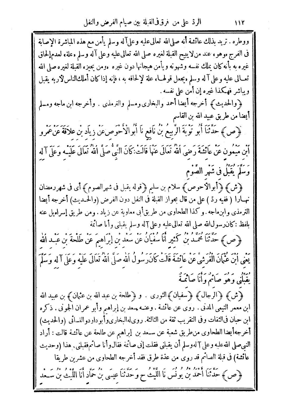 (ش) (الرجال) (سفيان) الثورى. و (طلحة بن عبد الله بن عثمان) بن عبيد الله ابن معمر التيمى المدنى. روى عن عائشة. وعنه سعد بن ابراهيم وأبو عمران الجونى. ذكره ابن حبان في الثقات وفي التقريب ثقة من الثالثة. روى له البخارى وأبو داود والنسائى (والحديث) أخرجه أيضا الطحاوى من طريق شعبة عن سعد بن إبراهيم عن طلحة عن عائشة قالت: أراد النبي صلى الله عليه وعلى آله وسلم أن يقبلنى فقلت إنى صائمة فقال وأنا صائم فقبلنى، هذا (وحديث عائشة) في قبلة الصائم قد روى من عدة طرق فقد أخرجه الطحاوى من عشرين طريقا