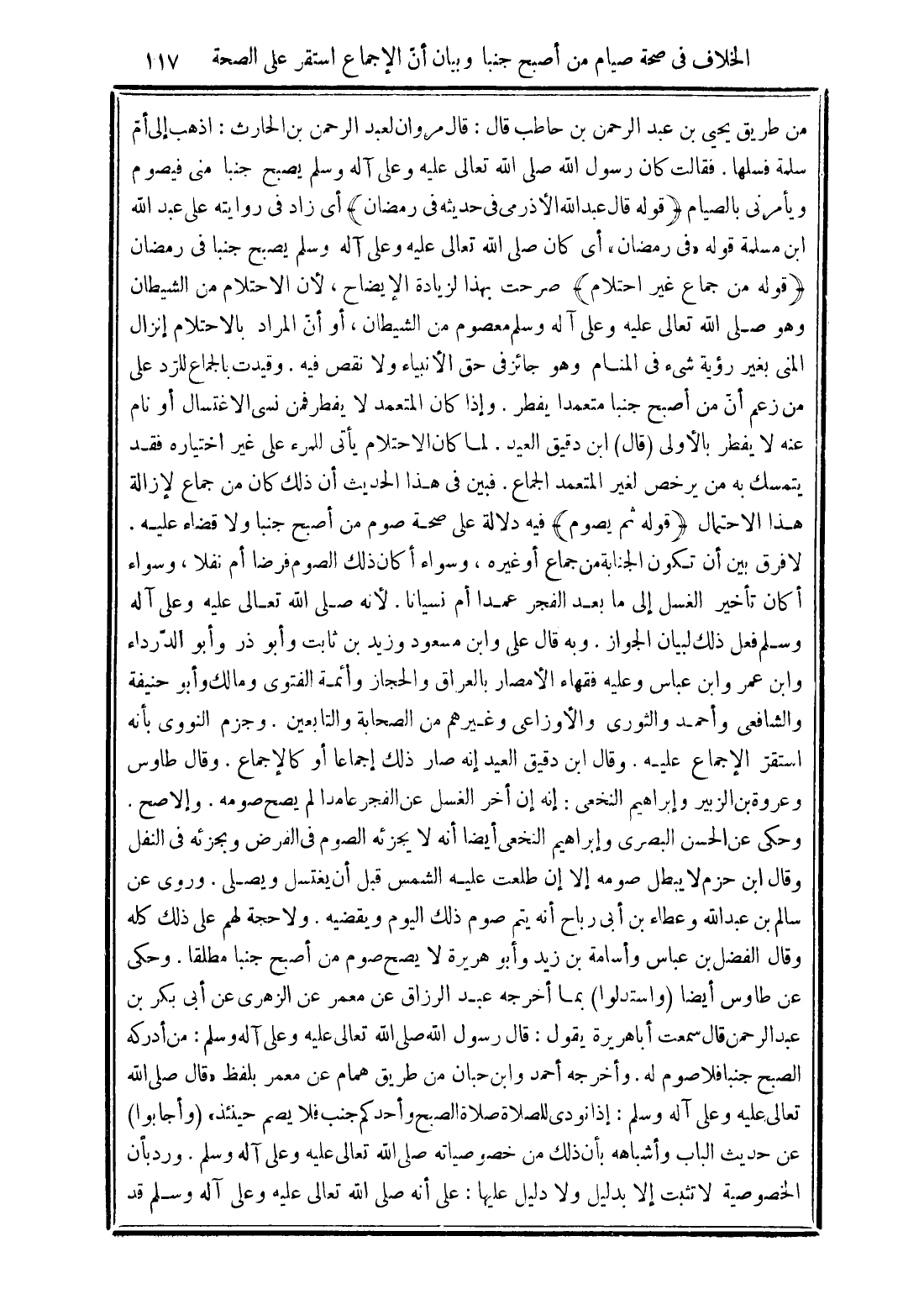 من طريق يحيى بن عبد الرحمن بن حاطب قال: قال مروان لعبد الرحمن بن الحارث: اذهب إلى أمّ سلمة فسلها. فقالت كان رسول الله صلى الله تعالى عليه وعلى آله وسلم يصبح جنبا منى فيصوم ويأمرنى بالصيام