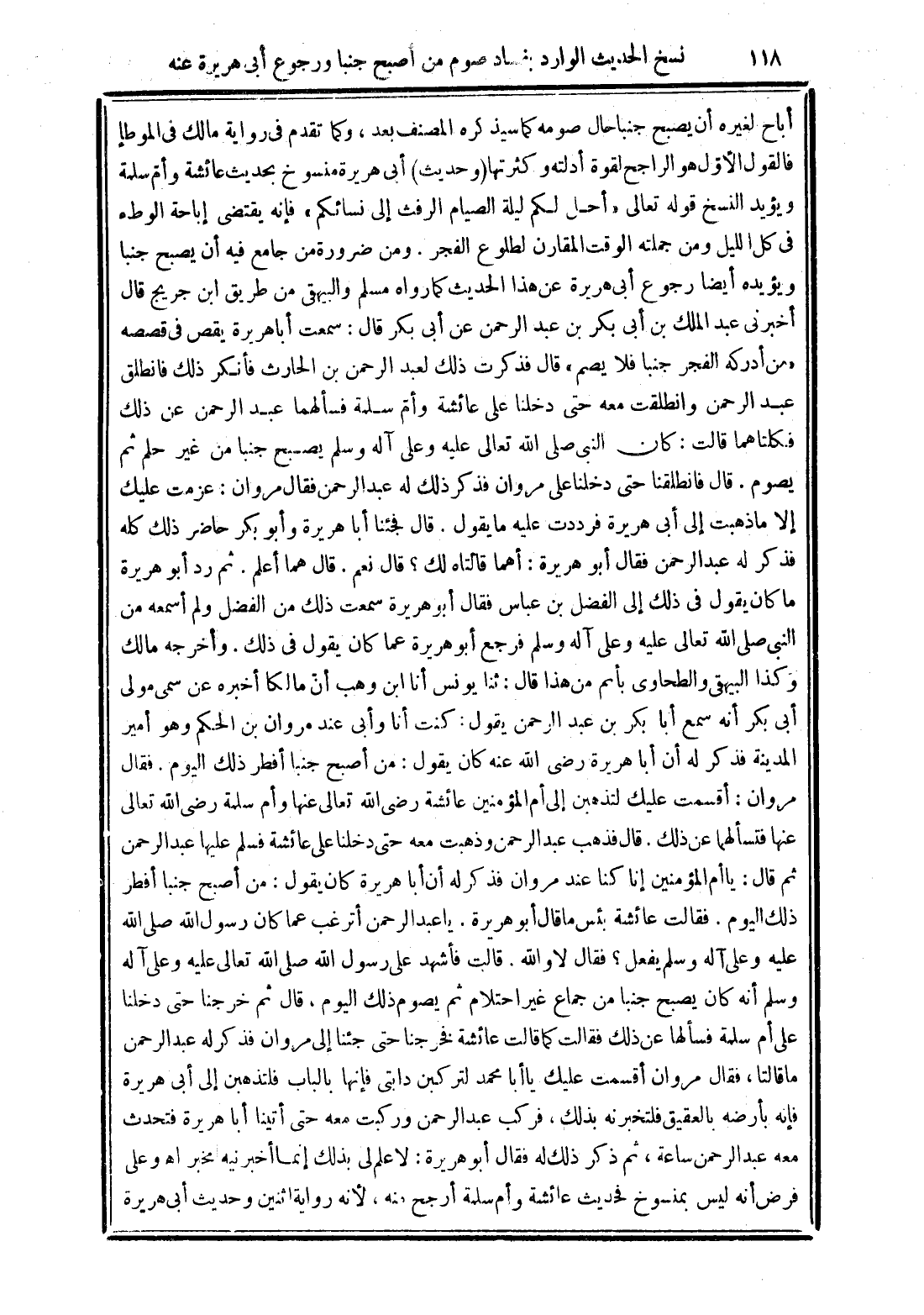أباح لغيره أن يصبح جنبا حال صومه كما سيذكره المصنف بعد، وكما تقدم فى رواية مالك فى الموطإ فالقول الأوّل هو الراجح لقوة أدلته وكثرتها (وحديث) أبى هريرة منسوخ بحديث عائشة وأمّ سلمة ويؤيد النسخ قوله تعالى {أُحِلَّ لَكُمْ لَيْلَةَ الصِّيَامِ الرَّفَثُ إِلَى نِسَائِكُمْ} فإنه يقتضى إباحة الوطء فى كل الليل ومن جملته الوقت المقارن لطلوع الفجر. ومن ضرورة من جامع فيه أن يصبح جنبا ويؤيده أيضا رجوع أبي هريرة عن هذا الحديث كما رواه مسلم والبيهقى من طريق ابن جريج قال أخبرنى عبد الملك ابن أبى بكر بن عبد الرحمن عن أبى بكر قال: سمعت أباهريرة يقص فى قصصه "من أدركه الفجر جنبا فلا يصم" قال فذكرت ذلك لعبد الرحمن بن الحارث فأنكر ذلك فانطلق عبد الرحمن وانطلقت معه حتى دخلنا على عائشة وأمّ سلمة فسألها عبد الرحمن عن ذلك فكلتاهما قالت: كان النبى صلى الله تعالى عليه وعلى آله وسلم يصبح جنبا من غير حلم ثم يصوم. قال فانطلقنا حتى دخلنا على مروان فذكر ذلك له عبد الرحمن فقال مروان: عزمت عليك إلا ما ذهبت إلى أبى هريرة فرددت عليه ما يقول. قال فجئنا أباهريرة وأبو بكر حاضر ذلك كله فذكر له عبد الرحمن فقال أبو هريرة: أهما قالتاه لك؟ قال نعم. قال هما أعلم. ثم رد أبو هريرة ما كان يقول فى ذلك إلى الفضل بن عباس فقال أبو هريرة سمعت ذلك من الفضل ولم أسمعه من النبى صلى الله تعالى عليه وعلى آله وسلم فرجع أبو هريرة عما كان يقول فى ذلك. وأخرجه مالك وكذا البيهقى والطحاوى بأتم من هذا قال: ثنا يونس أنا ابن وهب أنّ مالكا أخبره عن سمى مولى أبى بكر أنه سمع أبا بكر بن عبد الرحمن يقول: كنت أنا وأبى عند مروان بن الحكم وهو أمير المدينة فذكر له أن أباهريرة رضى الله عنه كان يقول: من أصبح جنبا أفطر ذلك اليوم. فقال مروان: أقسمت عليك لتذهبن إلى أم المؤمنين عائشة رضى الله تعالى عنها وأم سلمة رضى الله تعالى عنها فتسألهما عن ذلك. قال فذهب عبد الرحمن وذهبت معه حتى دخلنا على عائشة فسلم عليها عبد الرحمن ثم قال: يا أم المؤمنين إنا كنا عند مروان فذكر له أن أباهريرة كان يقول: من أصبح جنبا أفطر ذلك اليوم. فقالت عائشة بئس ما قال أبو هريرة. يا عبد الرحمن أترغب عما كان رسول الله صلى الله عليه وعلى آله وسلم يفعل؟ فقال لا والله. قالت فأشهد على رسول الله صلى الله تعالى عليه وعلى آله وسلم أنه كان يصبح جنبا من جماع غير احتلام ثم يصوم ذلك اليوم، قال ثم خرجنا حتى دخلنا على أم سلمة فسألها عن ذلك فقالت كما قالت عائشة فخرجنا حتى جئنا إلى مروان فذكر له عبد الرحمن ما قالتا، فقال مروان أقسمت عليك يا أبا محمد لتركبن دابتى فإنها بالباب فلتذهبن إلى أبى هريرة فإنه بأرضه بالعقيق فلتخبرنه بذلك، فركب عبد الرحمن وركبت معه حتى أتينا أباهريرة فتحدث معه عبد الرحمن ساعة، ثم ذكر ذلك له فقال أبو هريرة: لا علم لى بذلك إنما أخبرنيه مخبر اهـ وعلى فرض أنه ليس بمنسوخ فحديث عائشة وأم سلمة أرجح منه، لأنه رواية اثنين وحديث أبى هريرة