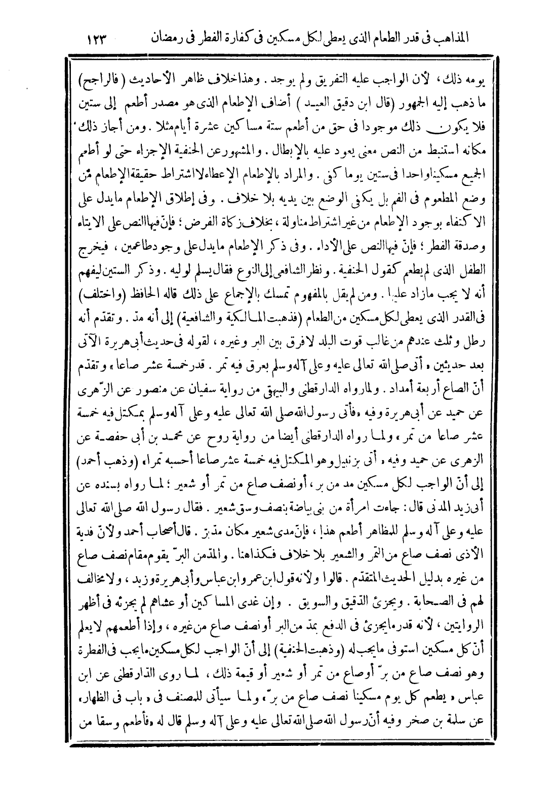 يومه ذلك، لأن الواجب عليه التفريق ولم يوجد. وهذا خلاف ظاهر الأحاديث (فالراجح) ما ذهب إليه الجمهور (قال ابن دقيق العيد) أضاف الإطعام الذى هو مصدر أطعم إلى ستين فلا يكون ذلك موجودا فى حق من أطعم ستة مساكين عشرة أيام مثلا. ومن أجاز ذلك مكانه استنبط من النص معنى يعود عليه بالإبطال. والمشهور عن الحنفية الإجزاء حتى لو أطعم الجميع مسكينا واحدا فى ستين يوما كفى. والمراد بالإطعام الإعطاء لا اشتراط حقيقة الإطعام من وضع المطعوم فى الفم بل يكفى الوضع بين يديه بلا خلاف. وفى إطلاق الإطعام ما يدل على الاكتفاء بوجود الإطعام من غير اشتراط مناولة، بخلاف زكاة الفرض؛ فإنّ فيها النص على الايتاء وصدقة الفطر؛ فإنّ فيها النص على الأداء. وفى ذكر الإطعام ما يدل على وجود طاعمين، فيخرج الطفل الذى لم يطعم كقول الحنفية. ونظر الشافعى إلى النوع فقال يسلم لوليه. وذكر الستين ليفهم أنه لا يجب ما زاد عليها. ومن لم يقل بالمفهوم تمسك بالإجماع على ذلك قاله الحافظ (واختلف) فى القدر الذى يعطى لكل مسكين من الطعام (فذهبت المالكية والشافعية) إلى أنه مدّ. وتقدّم أنه رطل وثلث عندهم من غالب قوت البلد لا فرق بين البر وغيره، لقوله فى حديث أبى هريرة الآتى بعد حديثين "أتى صلى الله تعالى عليه وعلى آله وسلم بعرق فيه تمر. قدر خمسة عشر صاعا" وتقدّم أنّ الصاع أربعة أمداد. ولما رواه الدارقطنى والبيهقى من رواية سفيان عن منصور عن الزّهرى عن حميد عن أبى هريرة وفيه "فأتى رسول الله صلى الله تعالى عليه وعلى آله وسلم بمكتل فيه خمسة عشر صاعا من تمر" ولما رواه الدارقطنى أيضا من رواية روح عن محمد بن أبى حفصة عن الزهرى عن حميد وفيه "أتى بزنبيل وهو المكتل فيه خمسة عشر صاعا أحسبه تمرا" (وذهب أحمد) إلى أنّ الواجب لكل مسكين مد من بر، أو نصف صاع من تمر أو شعير؛ لما رواه بسنده عن أبى زيد المدنى قال: جاءت امرأة من بنى بياضة بنصف وسق شعير. فقال رسول الله صلى الله تعالى عليه وعلى آله وسلم للمظاهر أطعم هذا، فإنّ مدى شعير مكان مدّبّر. قال أصحاب أحمد ولأنّ فدية الأذى نصف صاع من التمر والشعير بلا خلاف فكذاهنا. والمدّ من البرّ يقوم مقام نصف صاع من غيره بدليل الحديث المتقدّم. قالوا ولأنه قول ابن عمر وابن عباس وأبى هريرة وزيد، ولا مخالف لهم فى الصحابة. ويجزئ الدّقيق والسويق. وإن غدى المساكين أو عشاهم لم يجزئه فى أظهر الروايتين، لأنه قدره ما يجزئ فى الدفع بمدّ من البر أو نصف صاع من غيره، وإذا أطعمهم لا يعلم أنّ كل مسكين استوفى ما يجب له (وذهبت الحنفية) إلى أنّ الواجب لكل مسكين ما يجب فى الفطرة وهو نصف صاع من برّ أو صاع من تمر أو شعير أو قيمة ذلك، لما روى الدّارقطنى عن ابن عباس "يطعم كل يوم مسكينا نصف صاع من برّ" ولما سيأتى للمصنف فى "باب فى الظهار" عن سلمة بن صخر وفيه أنّ رسول الله صلى الله تعالى عليه وعلى آله وسلم قال له "فأطعم وسقا من